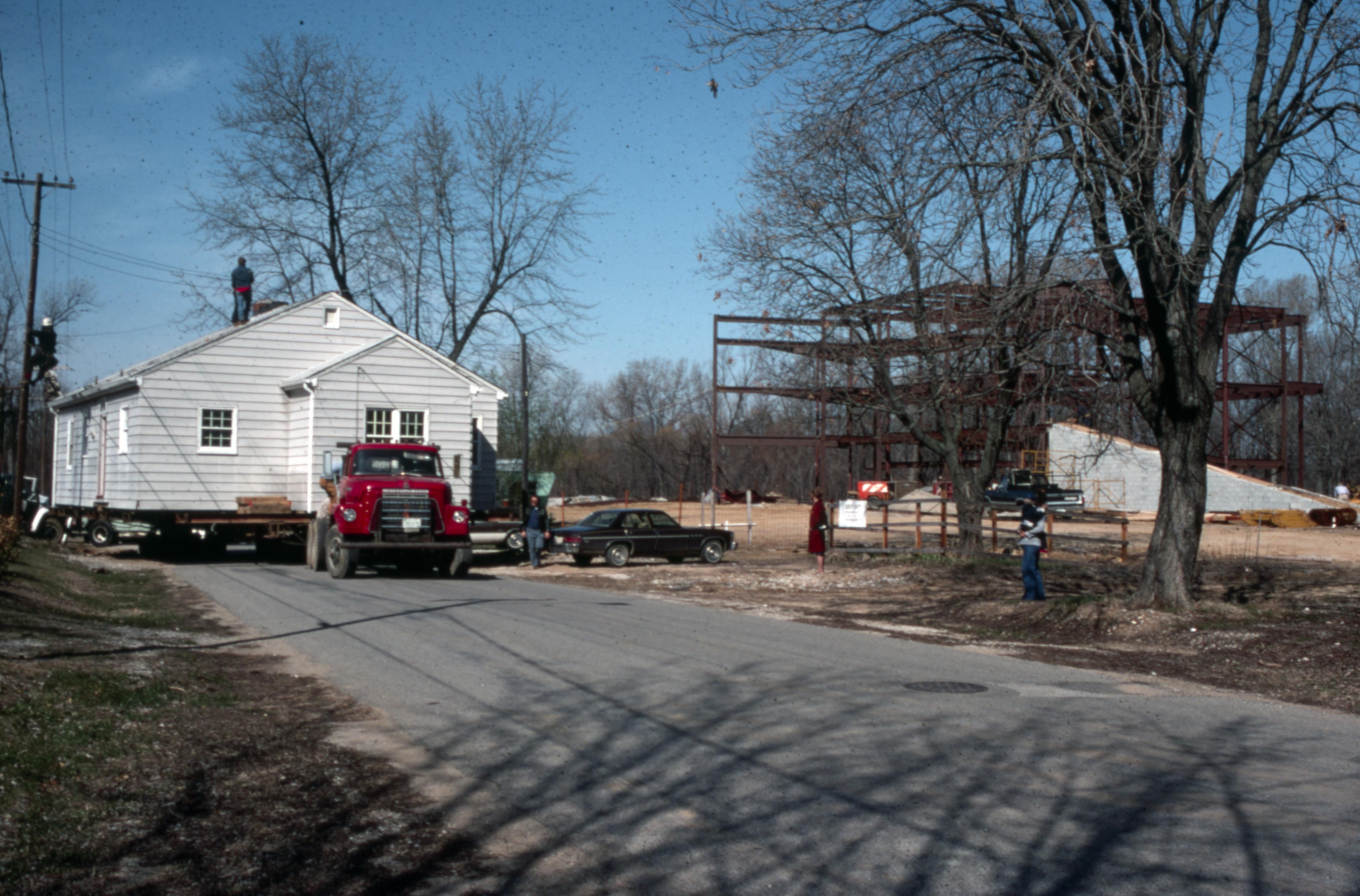Relocations Collection: Fisher House. The Fisher House was moved from an area just north of the old Harmonist Cemetery to 715 West Street. Elmer Buchta Trucking Company was tasked with accomplishing this move as well as many other building relocations during this time. Construction on the New Harmony Atheneum visitor's center can be seen on the right side of the photo.