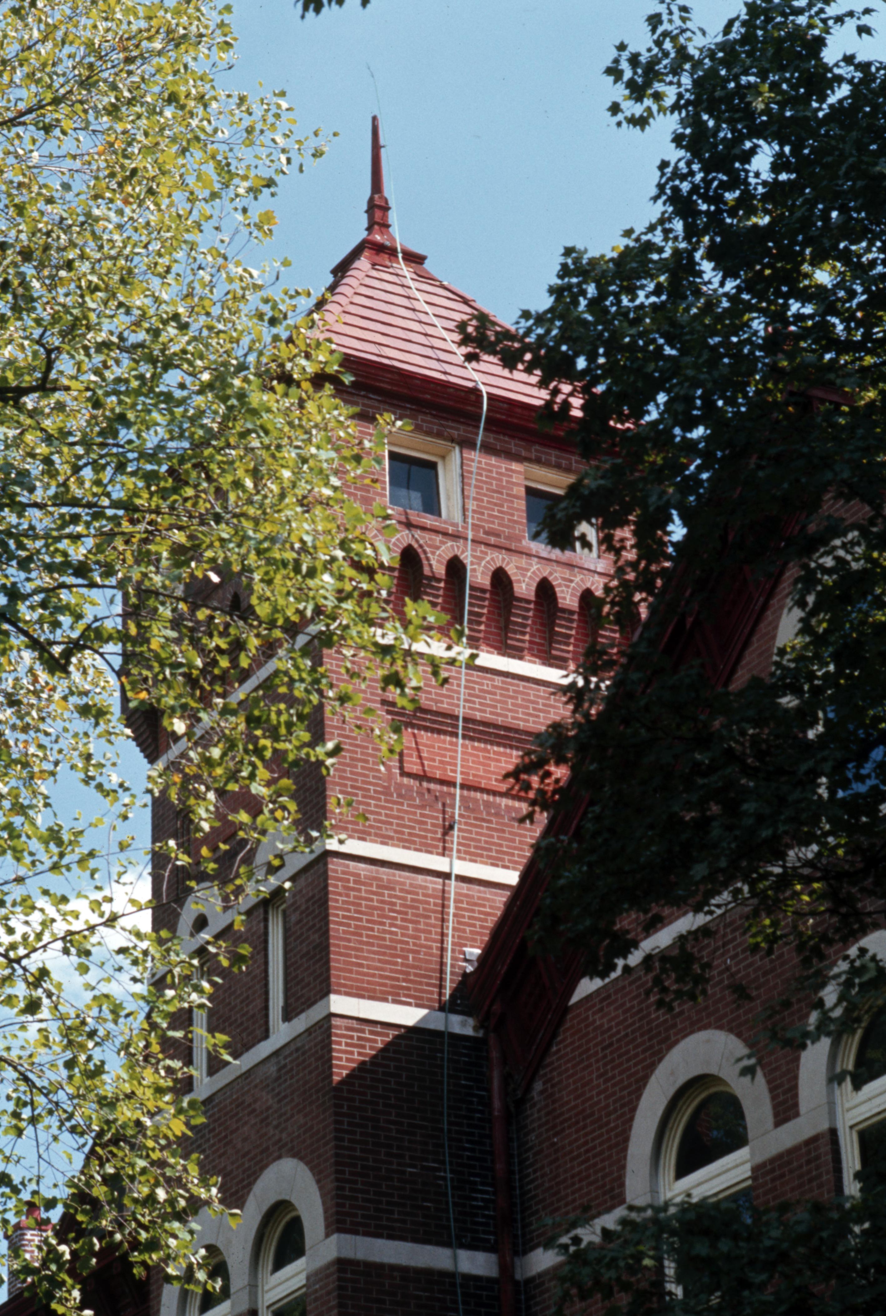 Working Men's Institute: This building is located 407 Tavern Street. The Working Men's Institute was founded in 1838, by William Maclure, as a library for working people, not just those who were wealthy. Initially there were a total of 160 Working Men's Institutes, 144 in the state of Indiana and 16 in the state of Illinois, however, the one in New Harmony Indiana is the only one which still remains. The present location of the WMI was completed in 1894, now a National Historic Landmark, before this it was housed in the old Harmonist Church from 1834 until the new building was completed. The WMI also houses a museum as well as the oldest working library in the state of Indiana. This is a photo of the WMI tower.