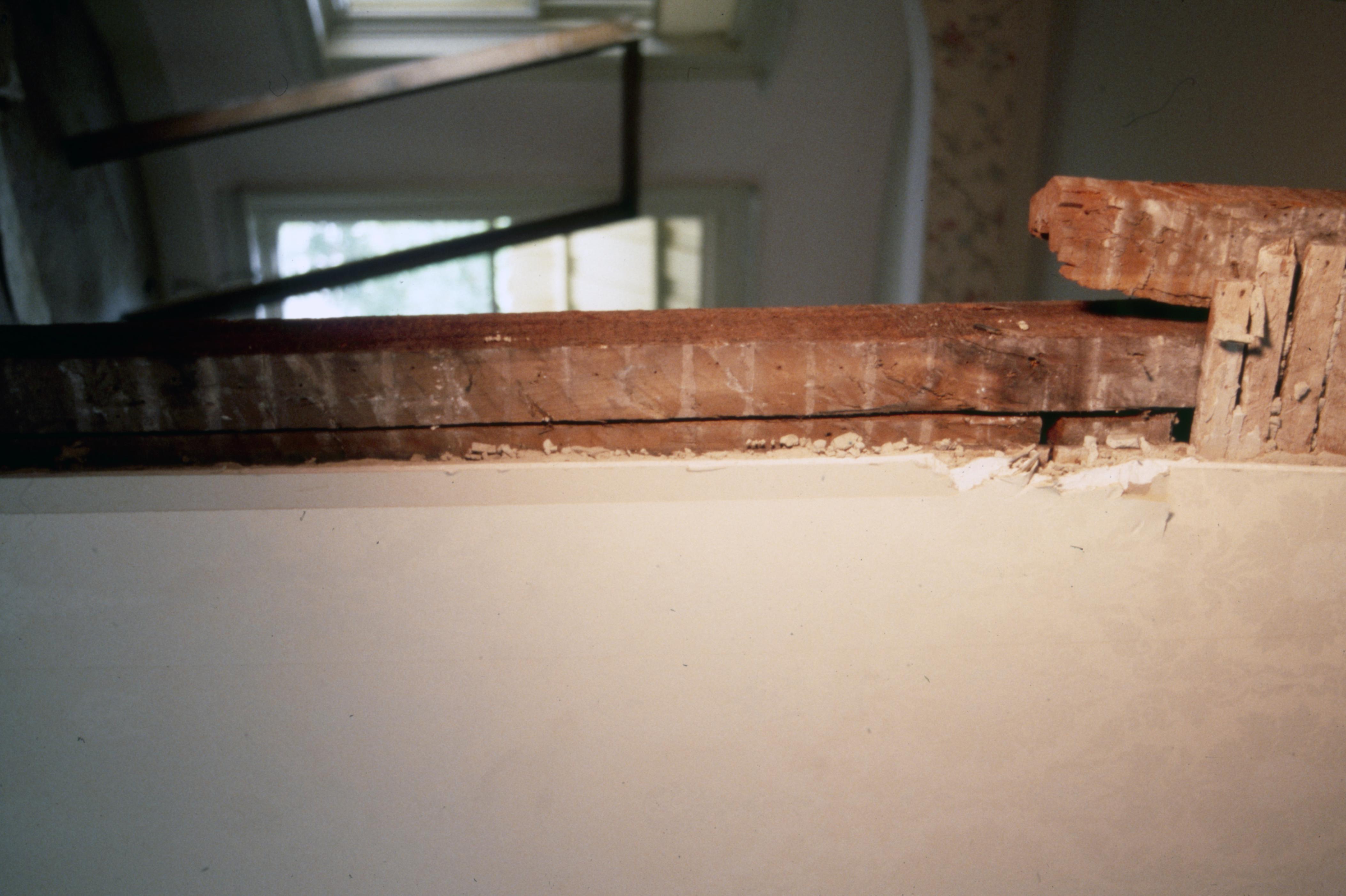 Schnee House: This photo is of the second Schnee home located at 603 West Street and was constructed in 1876. The first Schnee home was constructed during the Rappite occupation of the town, the Schnee brothers having moved to the town from the Quaker colony in Pennsylvania, and that house was located at 517 Tavern Street. The Gypsy Girl Livery Stable was later constructed behind that home. Possible writing on the end edges of the plank floor where the stairwell was replaced.