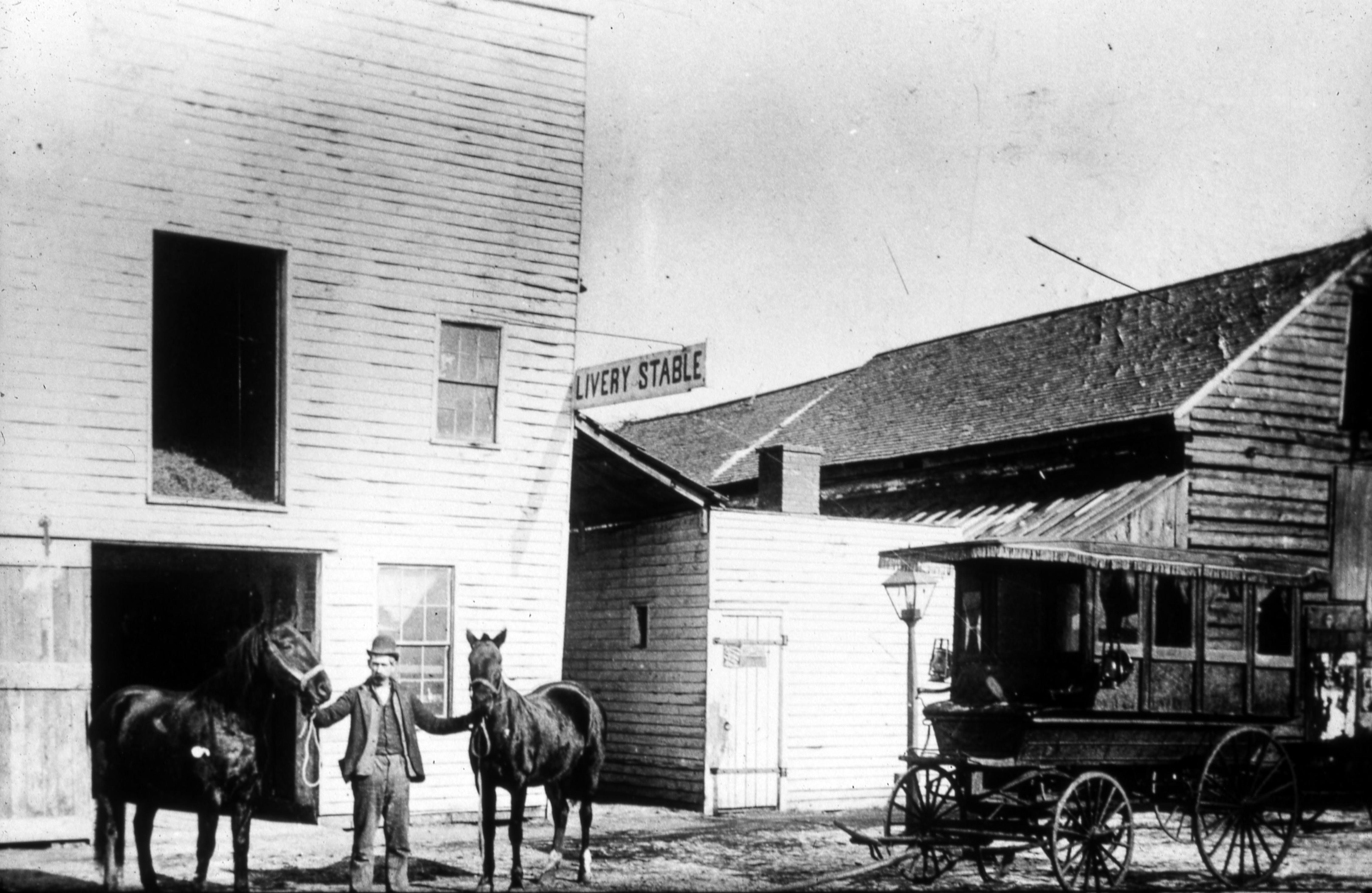 Streets: This historic photo of the north side of tavern street, between Main and Brewery, was taken after 1888 but before 1907. The buildings from right to left are: F. C. Husband Hardware and Groceries, The New Harmony Jail, the Livery Stable (either Pitt's & Smith or later Pote's), and on the far left side The Blacksmith's Shop (more of it is visible on the actual slide). Note the water well in front of Husband's shop.