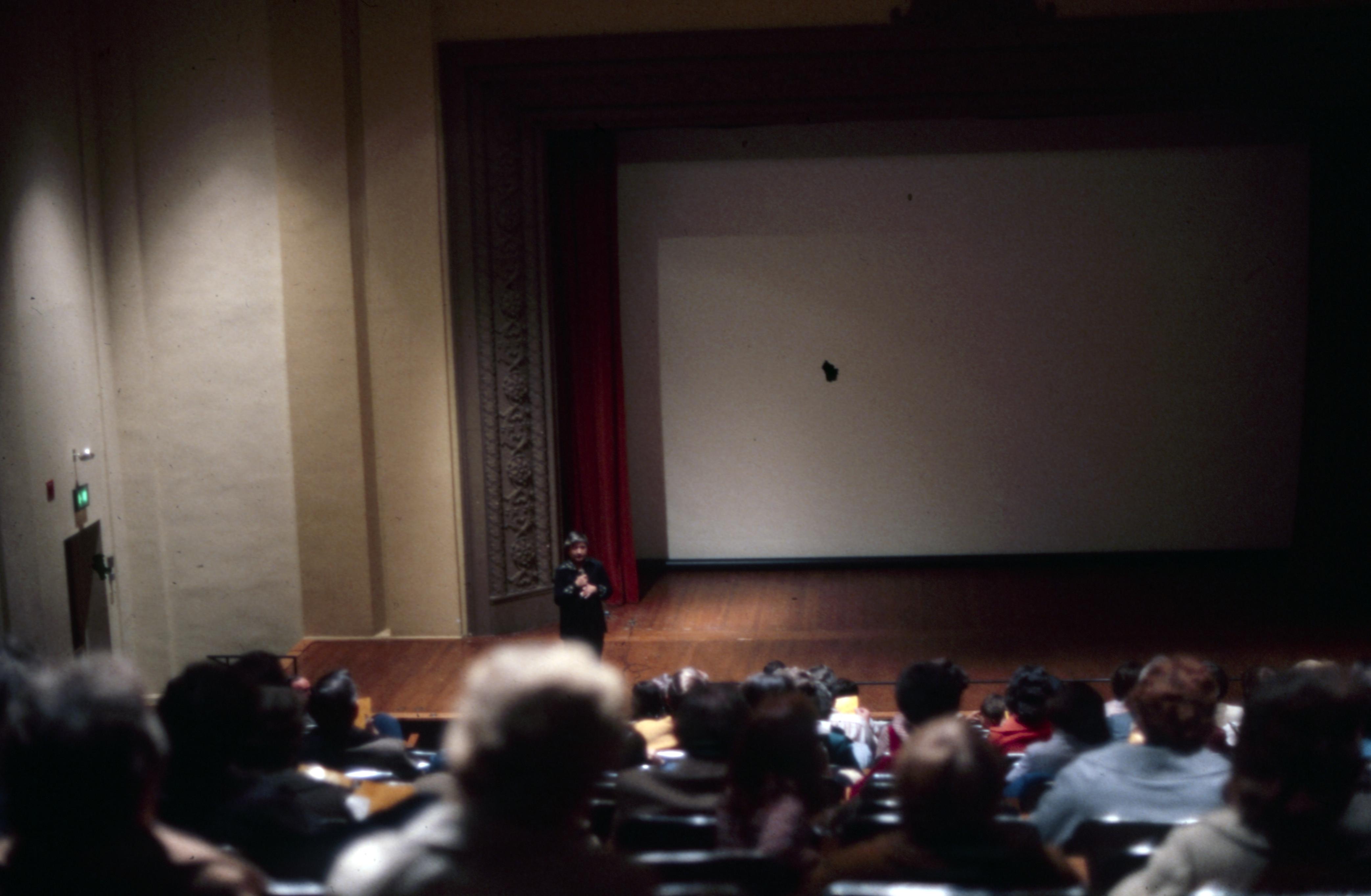 Murphy Auditorium: Murphy Auditorium is located at 419 Tavern Street and was constructed on the plat just east of the Working Men's Institute from 1911 to 1913, using the Doctor Edward Murphy Fund, and was built as part of New Harmony's centennial celebration of 1914. In 2014, the town's bicentennial, Murphy Auditorium became the new home of the concert series Under The Beams, originally housed in the Rapp-Owen Granary. Today, the auditorium is owned by the University of Southern Indiana and is the home of The New Harmony Theater with a seating capacity of 360 people. In this photo a man is giving a speech before giving an award to another man.
