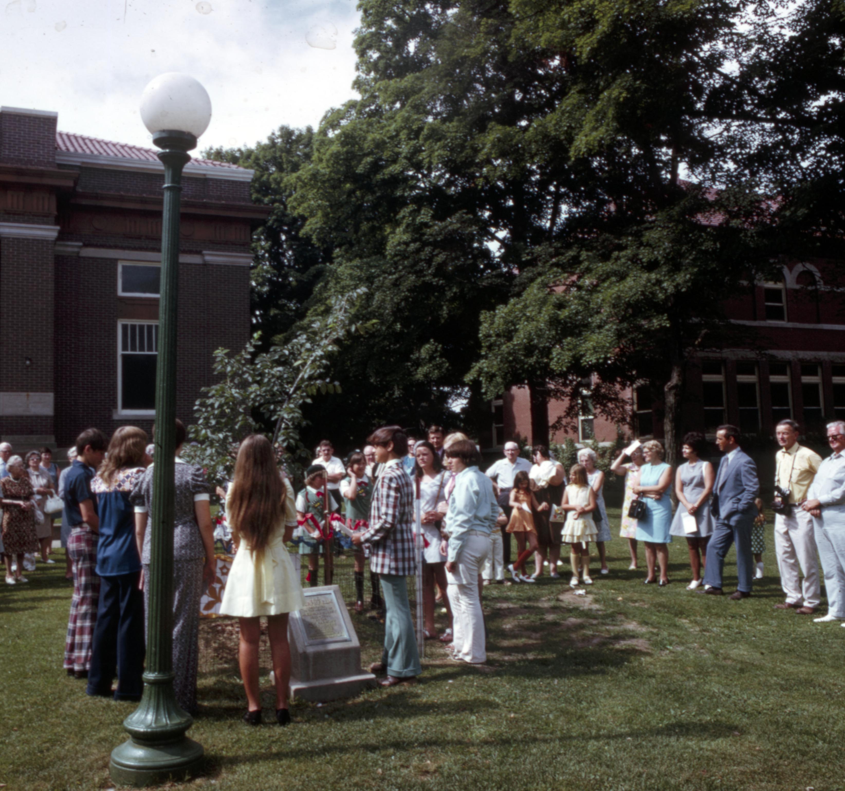 Guild Of Guides: The New Harmony chapter of the Indiana Junior Historical Society was called The Guild of Guides. The IJHS was formed in 1938 and this society had chapters, across the state of Indiana, which were formed by junior high and high school students who had an interest in historical things. The Guild of Guides produced a paper and photographs, in 1968, titled Architecture In New Harmony, Indiana, 1814 - 1969 which was published in a periodical produced by the IJHS. In this photo the group is standing, for the dedication of a tree, in front of the stone marker set at the front of Murphy Auditorium. This tree is still present in 2021 and is somewhat dislodging the stone marker.