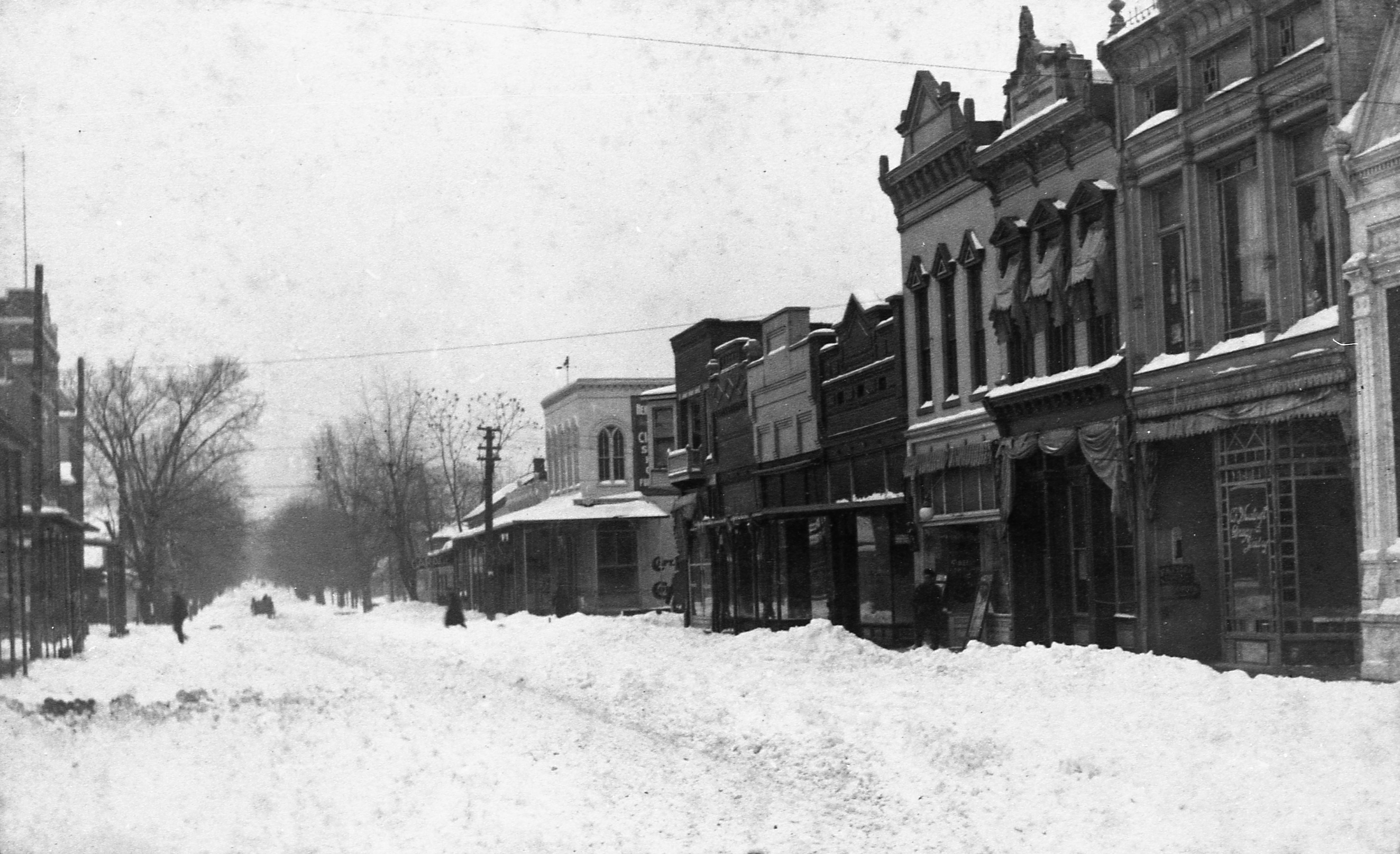 Transparencies and Negatives Collection: Historic photographs. This is a photo of Main Street, facing toward the south, between Church and Tavern Streets. It shows the Main Street business district after a heavy snowfall, which had to be after the August 1908 Monitor Corner Fire.