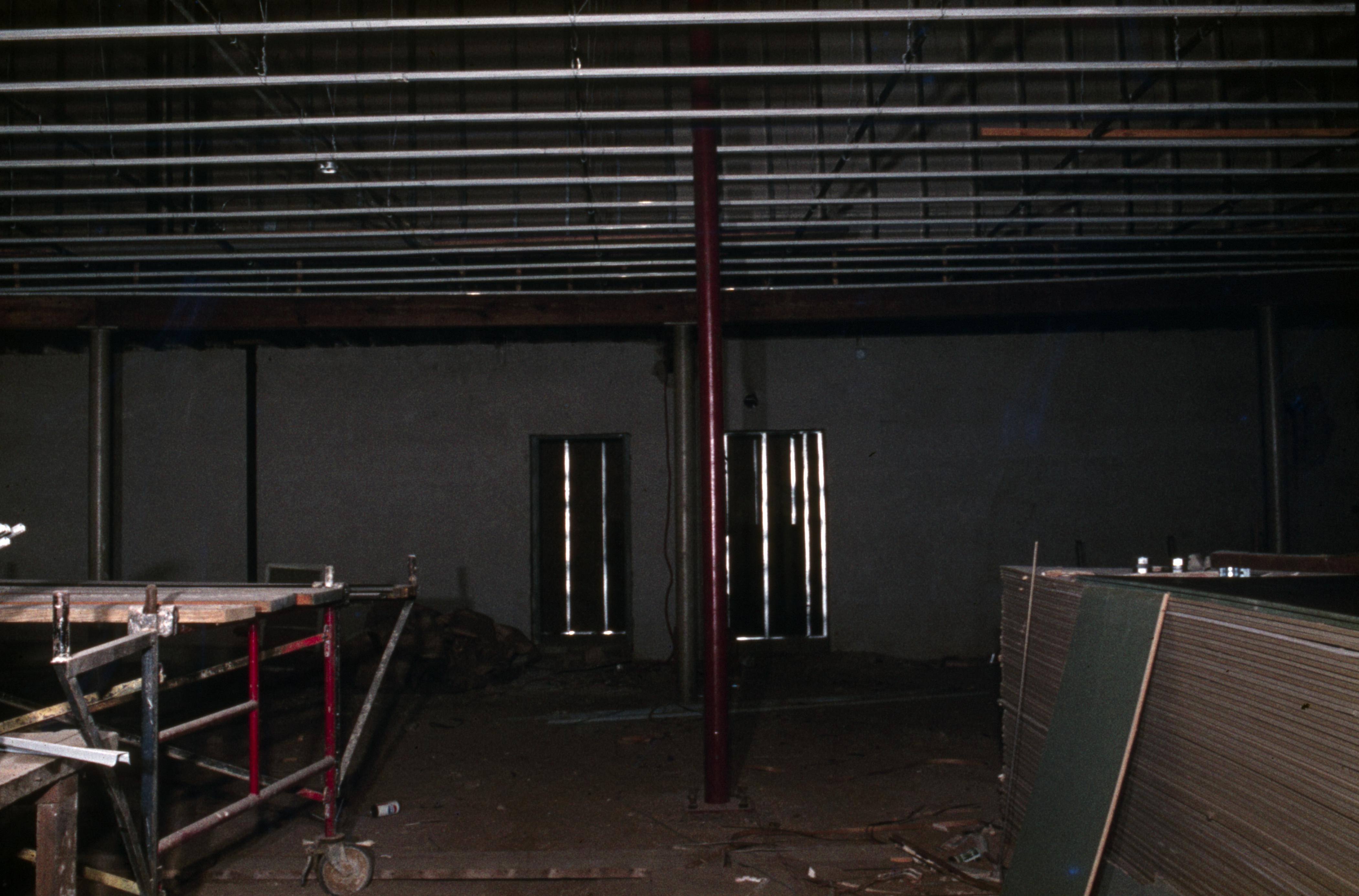 Murphy Auditorium: Murphy Auditorium is located at 419 Tavern Street and was constructed on the plat just east of the Working Men's Institute from 1911 to 1913, using the Doctor Edward Murphy Fund, and was built as part of New Harmony's centennial celebration of 1914. In 2014, the town's bicentennial, Murphy Auditorium became the new home of the concert series Under The Beams, originally housed in the Rapp-Owen Granary. Today, the auditorium is owned by the University of Southern Indiana and is the home of The New Harmony Theater with a seating capacity of 360 people. This is a photo of the refurbishment work which was undertaken in the basement level of the building.