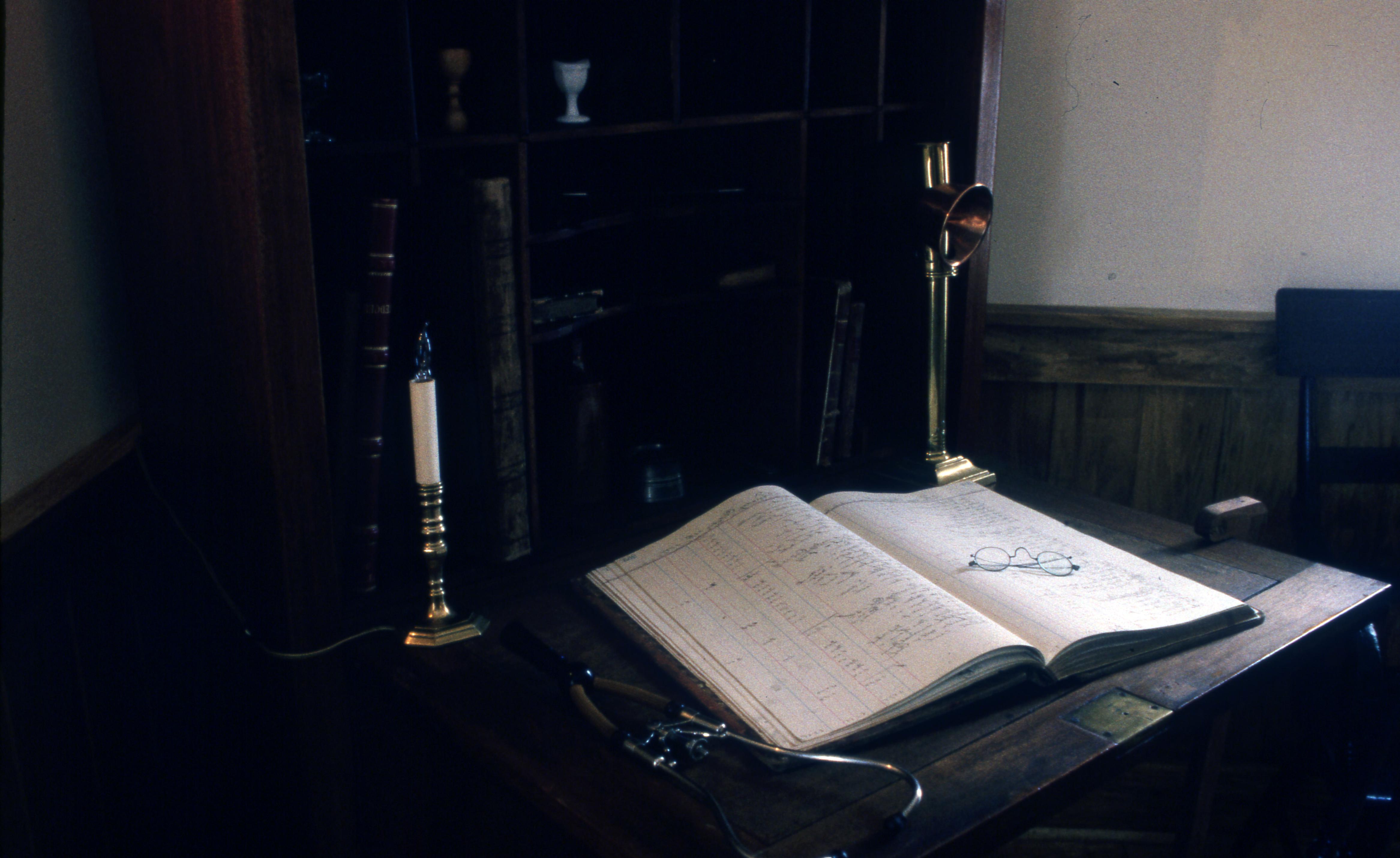 Kemmerling House/1850s Doctor's Office: The Kemmerling House was relocated from town Block 4 J/SE to the new location at 611 Church Street, beside the Beal House. The Kemmerling House was remodeled into the 1850s Doctor's Office, a gift to the town of New Harmony from Mead Johnson. The Kemmerlings were listed in the 1882 Posey County Directory (as Kimmerlin) as being New Harmony Township farmers. Elmer Buchta Moving Engineers was contracted for this and many other building moves during the 1970s. This photo shows the doctor's desk with the nineteenth century appointment book open with a pair of spectacles laying on it. There is a nineteenth stethoscope on the desk as well.