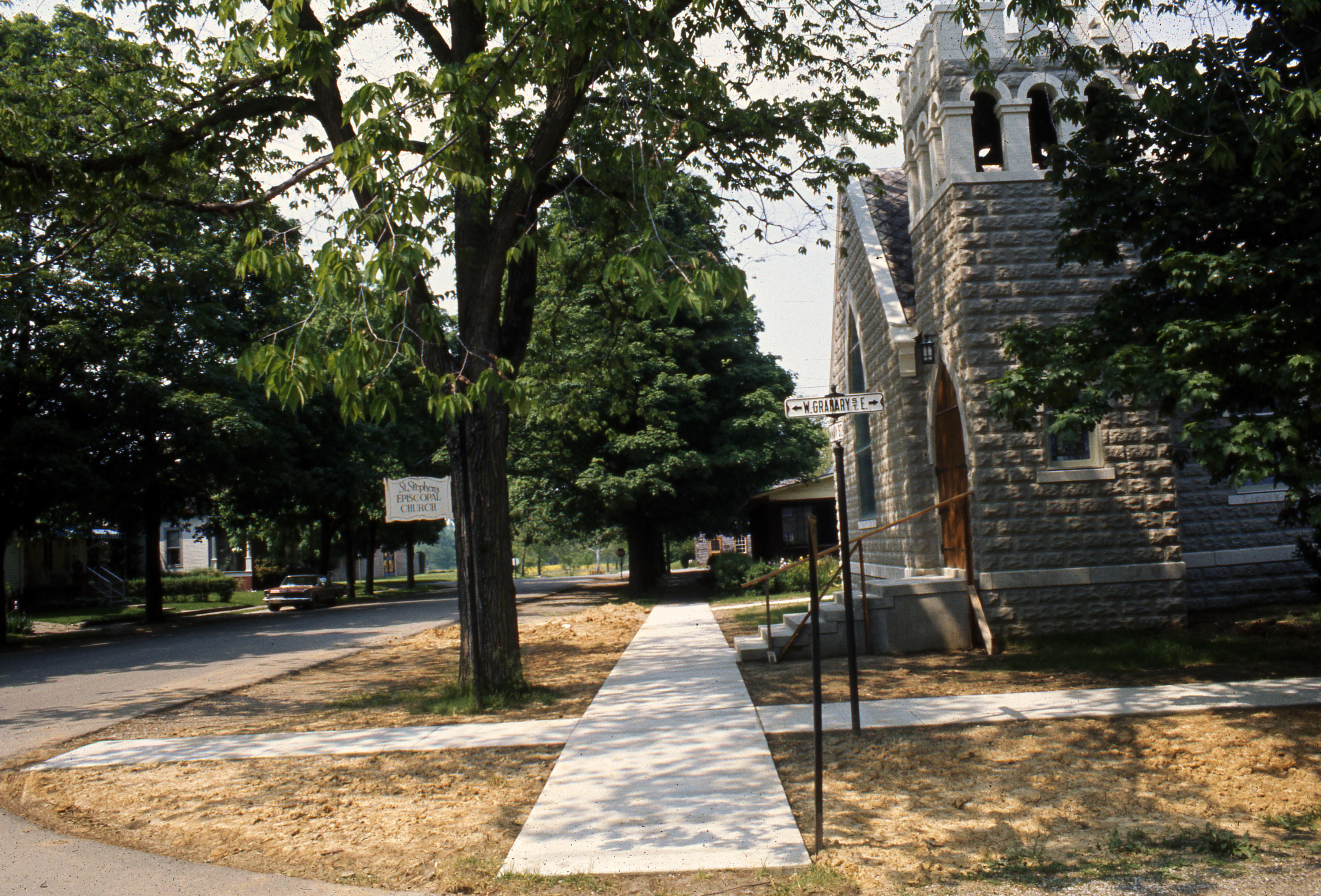 St. Stephen's Episcopal Church: The church was first organized in 1841 and in 1843 the west wing of the old Rappite church was given for use by the Episcopal�s by Alexander and Anne Maclure. At this time the old burial ground was also given to the church, which was bought back by the Rappites in 1846. Then in 1850 the Episcopal�s sold the west wing of the old Rappite Church for $1000 and in 1854 St. Stephen�s Church was constructed, the North Street location where the Lenz House now resides.1888 saw the construction of a new belfry add to the church to accommodate the new bell. In 1911 the new church was built, and an addition was made to it in 1927. The church is still present as of 2022. This photo shows the church before the iron fence was installed.