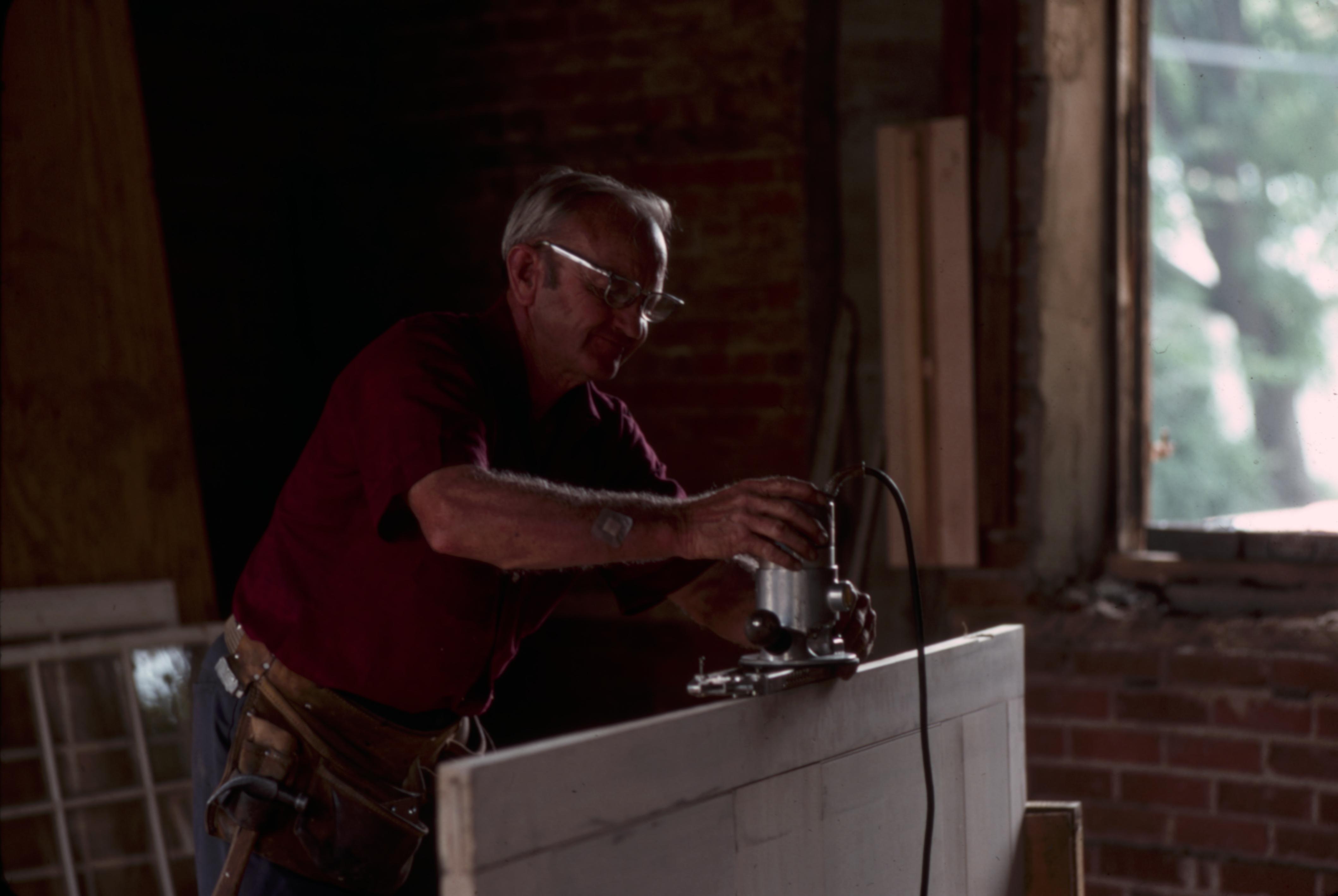 1830 Owen House: A construction worker is sanding part of one of the doors, for the 1830 Owen House.