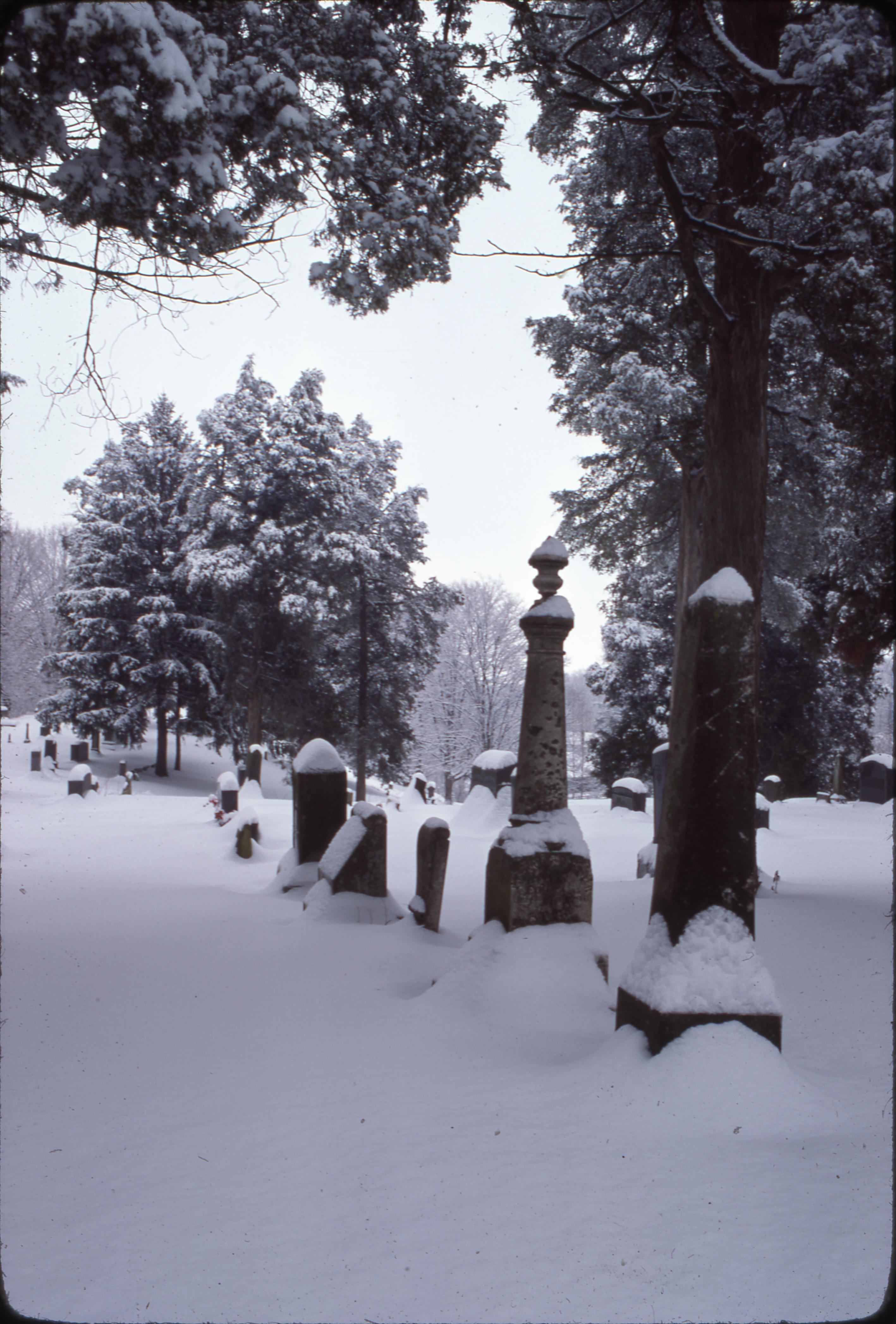 Maple Hill Cemetery: Winter Snow Cover, Obelisk and Pillar Headstones