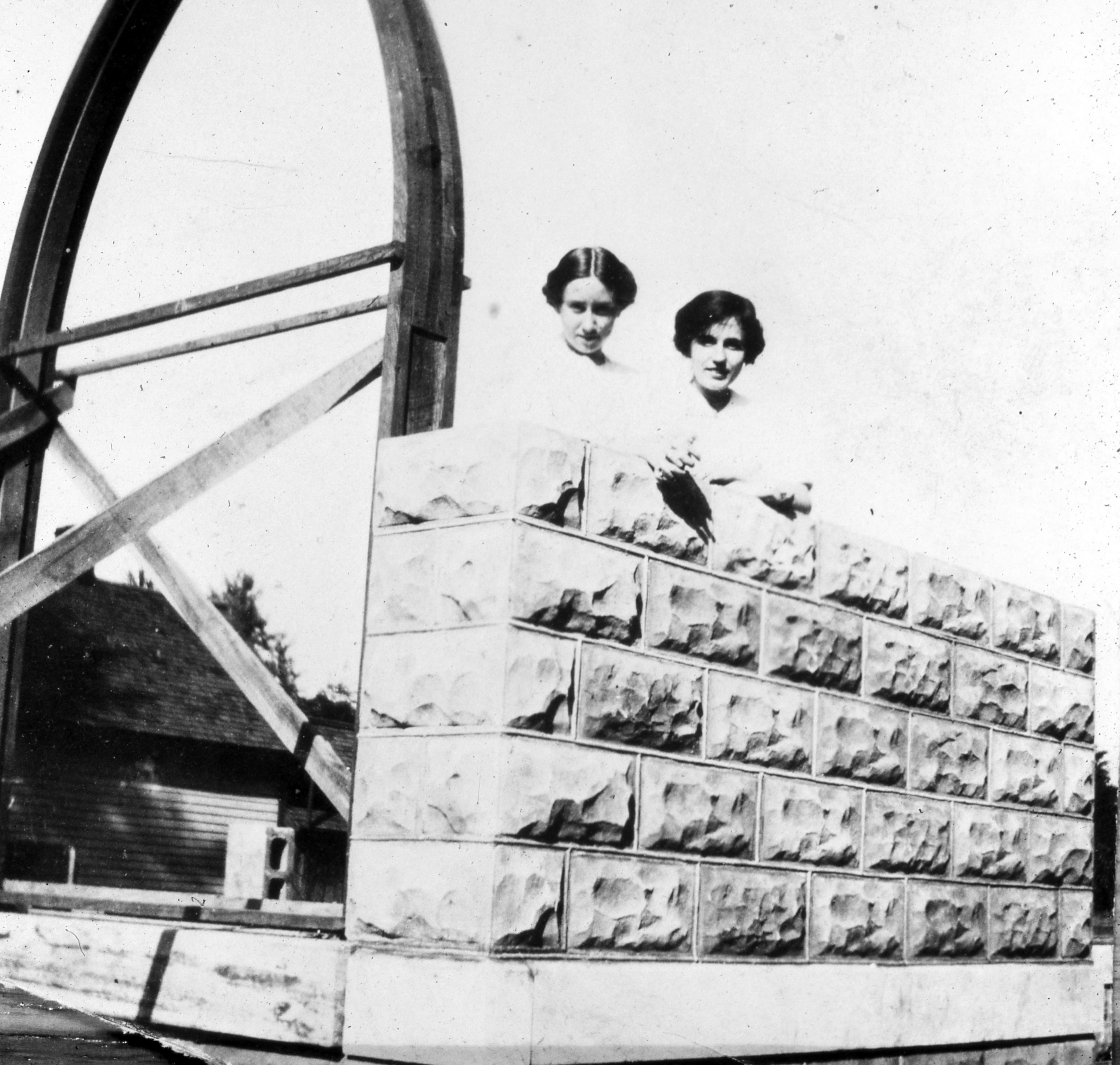 St. Stephen's Church: The church was first organized in 1841 and in 1843 the west wing of the old Rappite church was given for use by the Episcopal�s by Alexander and Anne Maclure. At this time the old burial ground was also given to the church, which was bought back by the Rappites in 1846. Then in 1850 the Episcopal�s sold the west wing of the old Rappite Church for $1000 and in 1854 St. Stephen�s Church was constructed, the North Street location where the Lenz House now resides.1888 saw the construction of a new belfry add to the church to accommodate the new bell. In 1911 the new church was built, and an addition was made to it in 1927. The church is still present as of 2022. This photo shows two young women posing inside the unfinished walls of the church as it was being constructed.