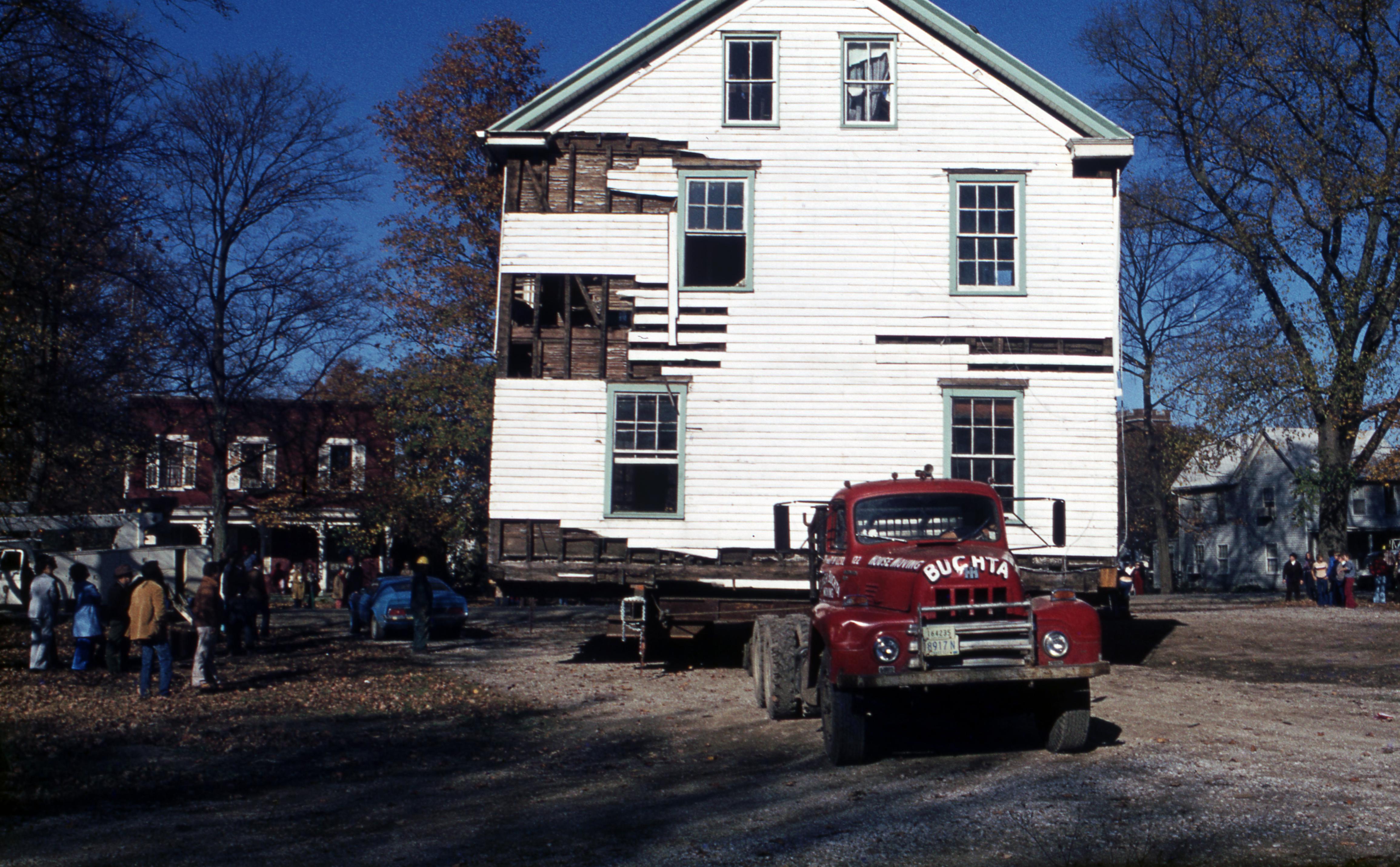 Golden House: This building was moved from the plat of 807 Church, what is now 811 Church Street, to one plat west of 723 E. Church Street but has since been demolished, most likely when the house at 707 E. Church was built in 2009. Elmer Buchta Moving Engineers was contracted for this and many other building moves during the 1970s. This photo shows the house as it was being pulled onto the new plat location. On the left side of the photo is the historic house at 704 Church Street. On the right side of the photo is the house on the corner of Church and Raintree Streets which was later demolished.
