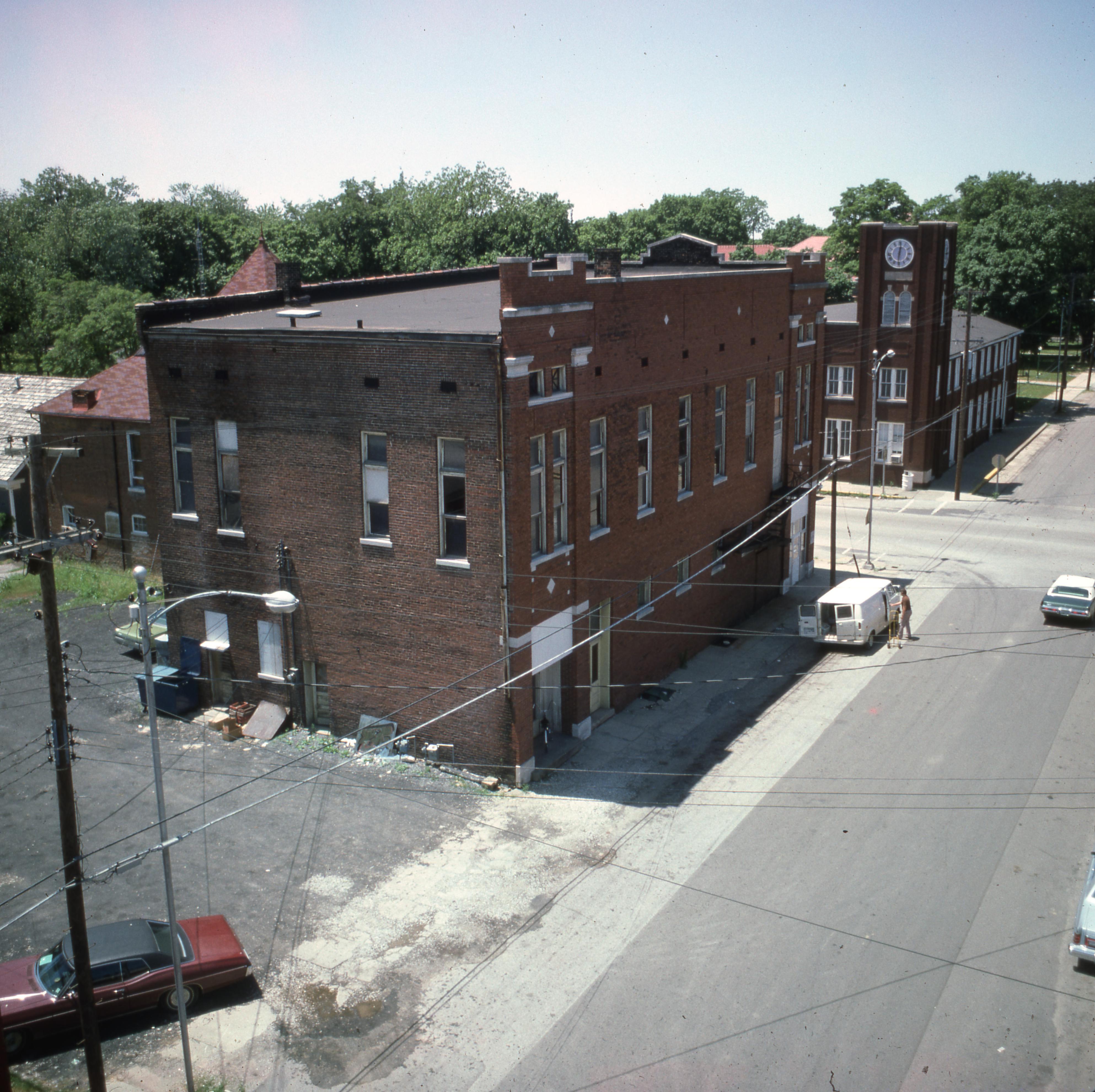 This is an aerial view of the old Independent Order of Odd Fellows and the old City Building. The Ribeyre Gymnasium can also be seen, across Main Street, on the right side of the photo.