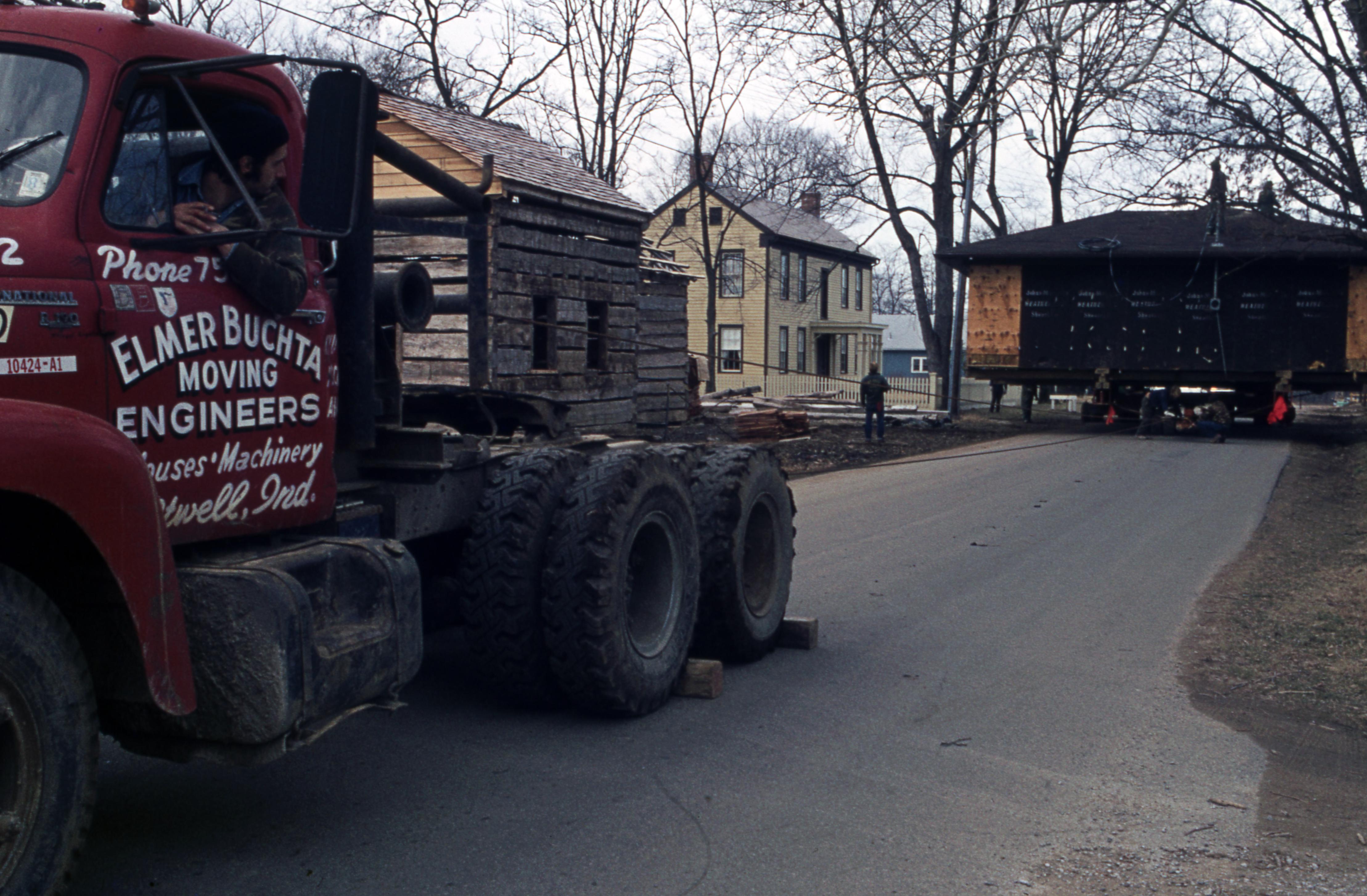 Bauer House: This house was originally located on the north side of North Street in town block 2 C/E. It was moved to the new location at 518 First Street before construction on the Atheneum had begun. Elmer Buchta Moving Engineers was contracted for this and many other building moves during the 1970s. This photo shows the house being pulled onto North Street headed toward the new plat at 518 First Street. The yellow house, on the left, is now the Orchard Guest House, located at 315 North Street.