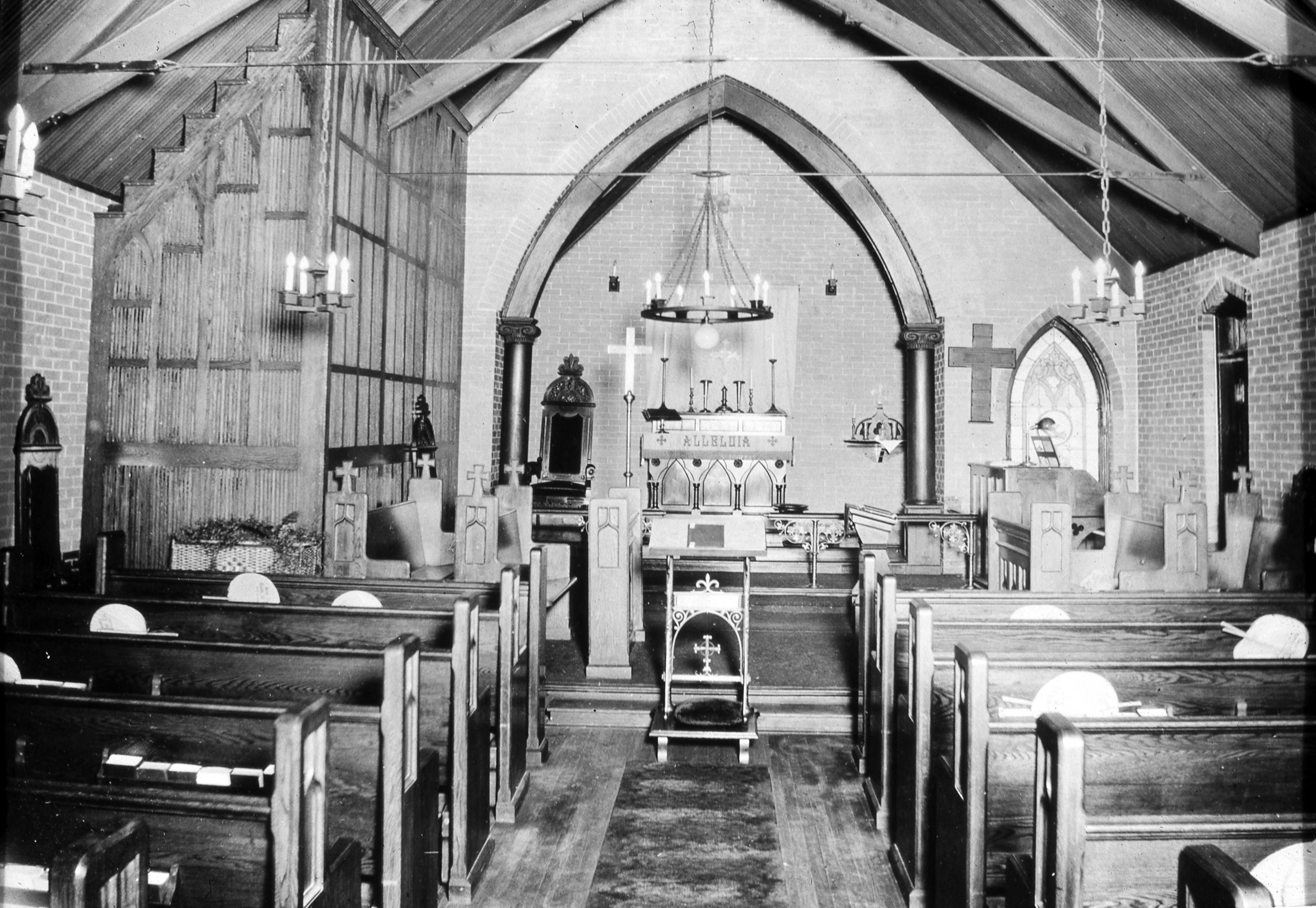 St. Stephen's Church: The church was first organized in 1841 and in 1843 the west wing of the old Rappite church was given for use by the Episcopal�s by Alexander and Anne Maclure. At this time the old burial ground was also given to the church, which was bought back by the Rappites in 1846. Then in 1850 the Episcopal�s sold the west wing of the old Rappite Church for $1000 and in 1854 St. Stephen�s Church was constructed, the North Street location where the Lenz House now resides.1888 saw the construction of a new belfry add to the church to accommodate the new bell. In 1911 the new church was built, and an addition was made to it in 1927. The church is still present as of 2022. This photo shows the inside of the church.