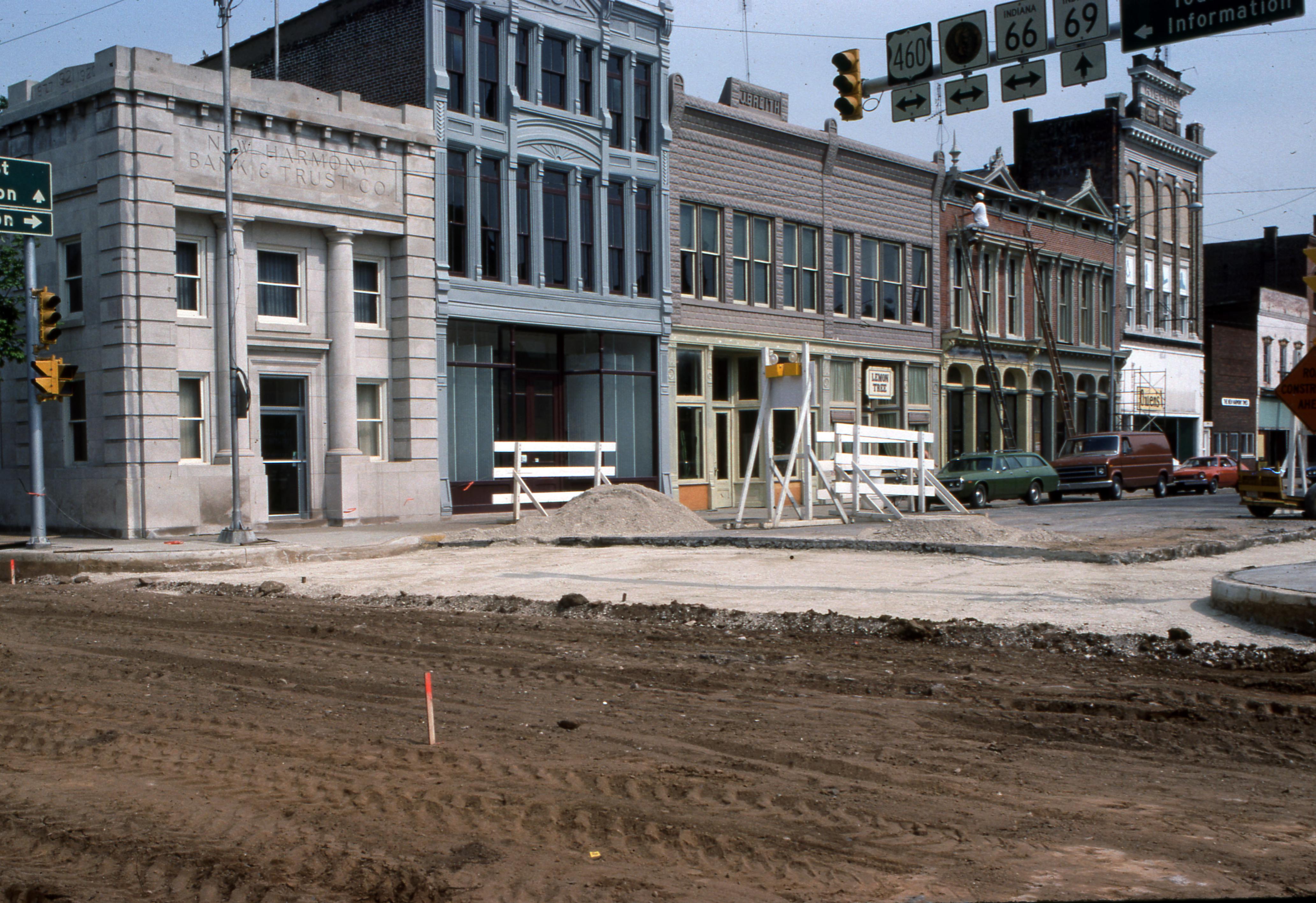 Streets: This is a photo of the businesses along the east side of Main Street, facing south, between Church and Tavern. From left to right: New Harmony Bank & Trust Company which had become the Posey County National Bank, the Privy Shop, the Kopper Kettle Gift Shop, The Lemon Tree ice cream parlor, Heart of Harmony antiques, Walz Pharmacy, Owen's Variety, The New Harmony Times newspaper, Sass and Poss's tavern, and an antique shop. Across Tavern Street is the old Independent Order of Odd Fellows Building. Note Church Street being repaved.