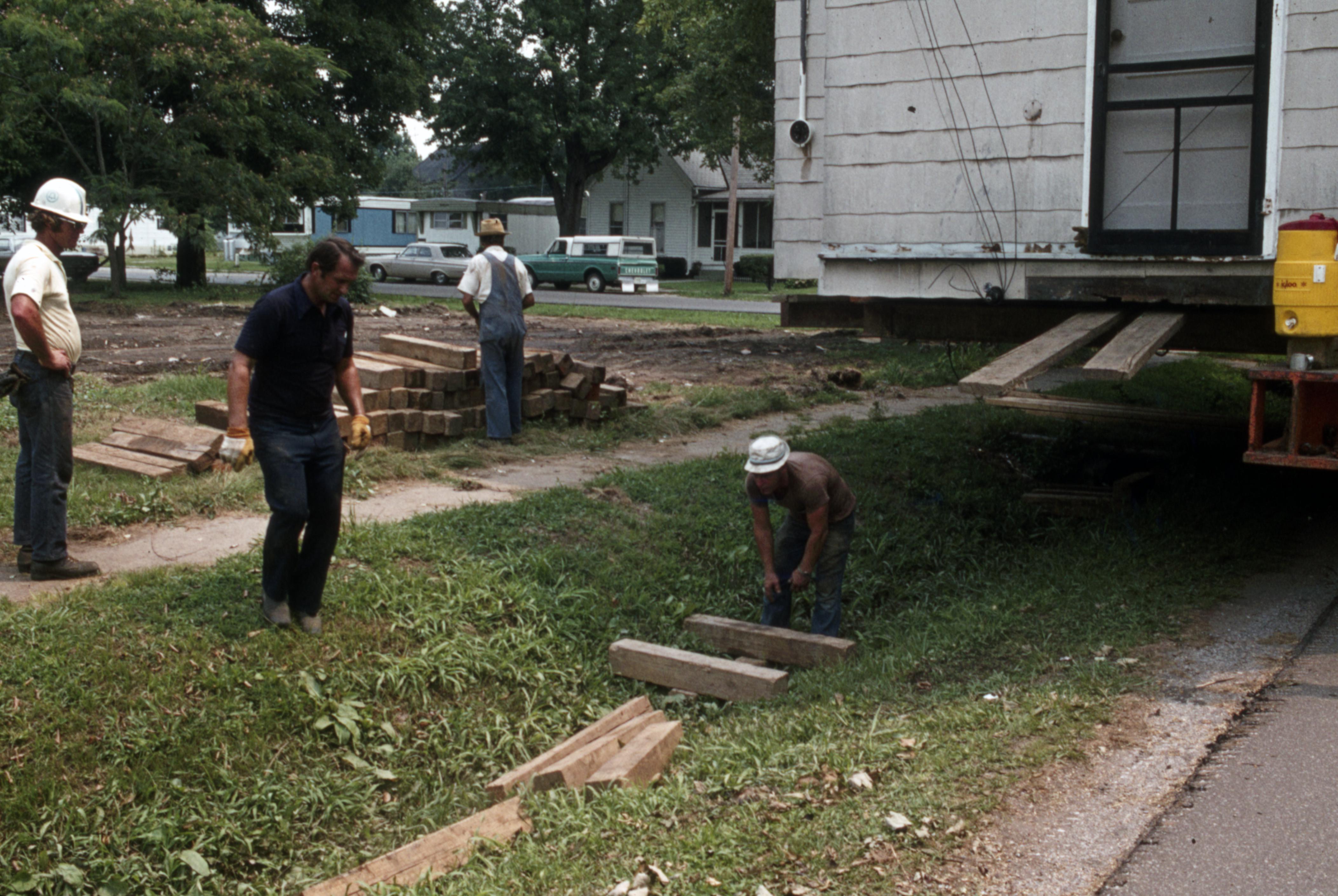 Barrett House Move: This house was originally located at 1826 Main Street but was then moved to 604 South Street during the Lanark Construction. Elmer Buchta were the movers. The ditch along Brewery Street being temporarily being filled with 6 inch x 6 inch timbers to keep the house level as it is taken onto the plat at 604 South Street.