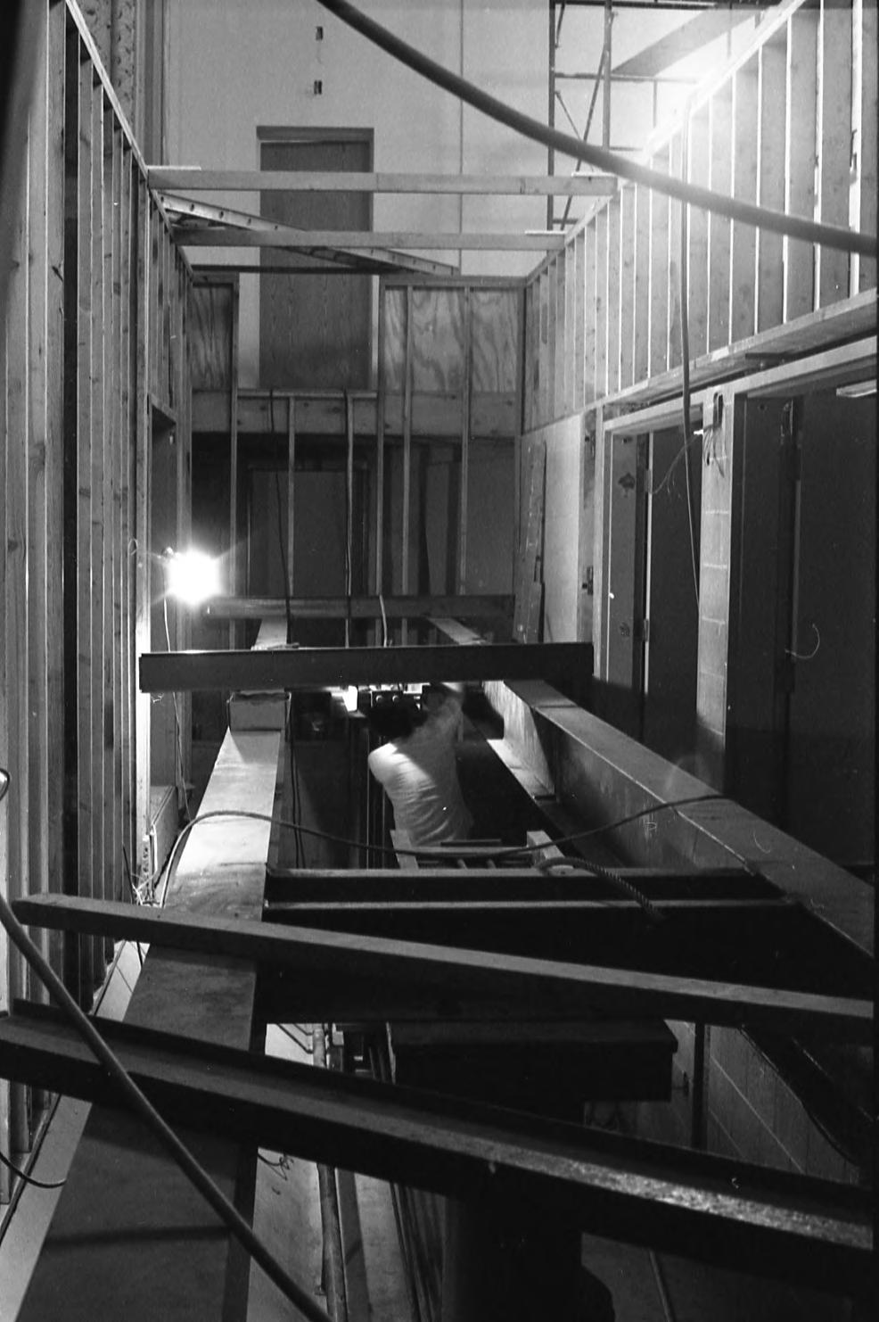 Transparencies and Negatives Collection: Historic photographs. Murphy Auditorium is located at 419 Tavern Street and was constructed on the plat just east of the Working Men's Institute from 1911 to 1913, using the Doctor Edward Murphy Fund, and was built as part of New Harmony's centennial celebration of 1914. In 2014, the town's bicentennial, Murphy Auditorium became the new home of the concert series Under the Beams, originally housed in the Rapp-Owen Granary. Today, the auditorium is owned by the University of Southern Indiana and is the home of The New Harmony Theater with a seating capacity of 360 people. This is a photo of construction on the stage lift.
