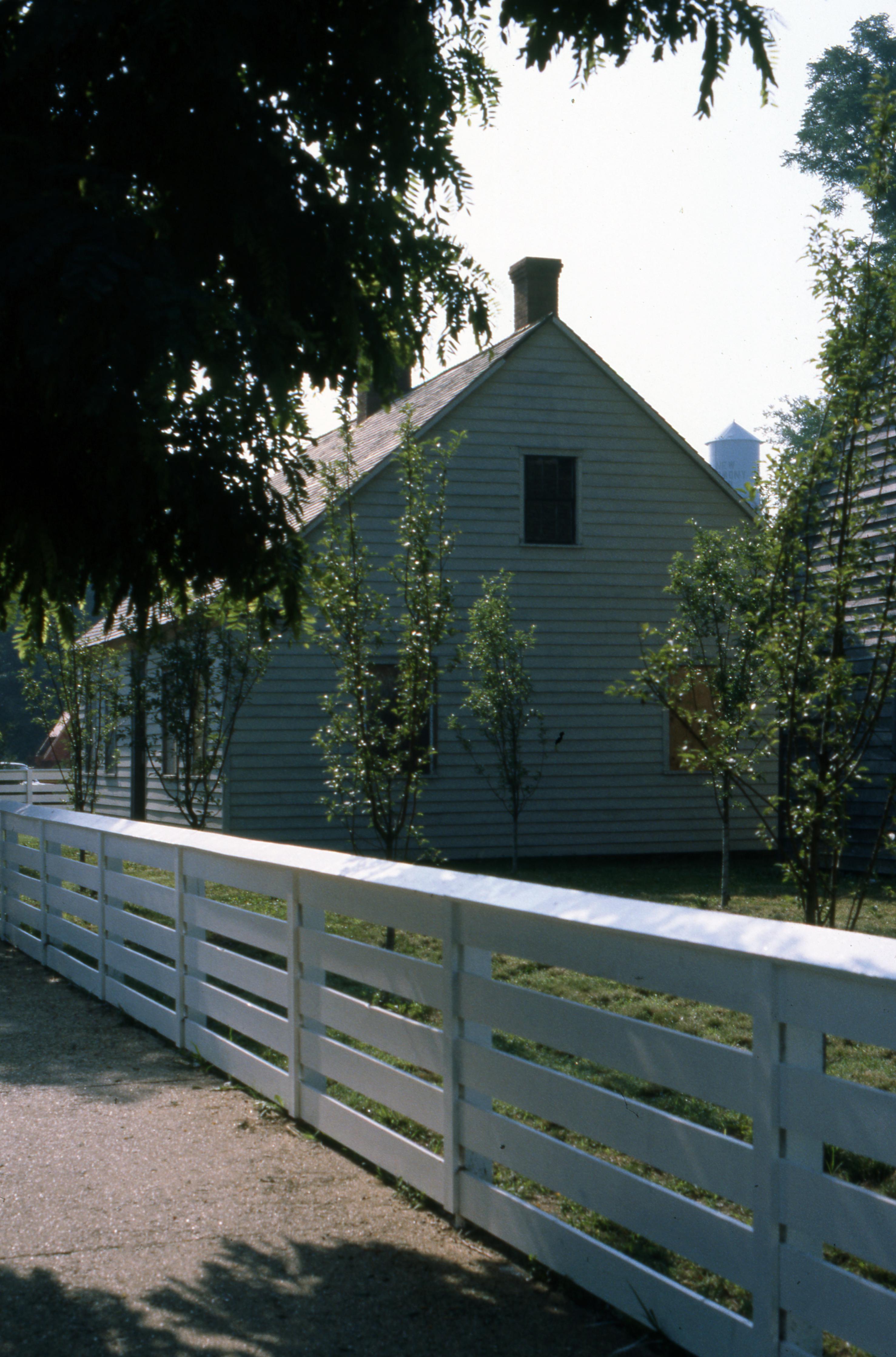 Beal House: The Beal House was moved during the Lanark Construction, on Town Block 8 E/W on Main Street to 611 Church Street. The Beal house was constructed around 1829 by John Beal, who was a carpenter in the Owen and Maclure community. Beal constructed the house from lumber and timbers from an older horse barn. The new location would be the site of the Beal House and 1850s Doctor's Office (The Doctor's Office was a remodel of the Kemmerling House, which was also moved to this site). Elmer Buchta Moving Engineers was contracted for this and many other building moves during the 1970s. This photo of the front side of the Beal and Kemmerling Houses faces east, toward the Texaco gas station. Note the old New Harmony water tower in the background.