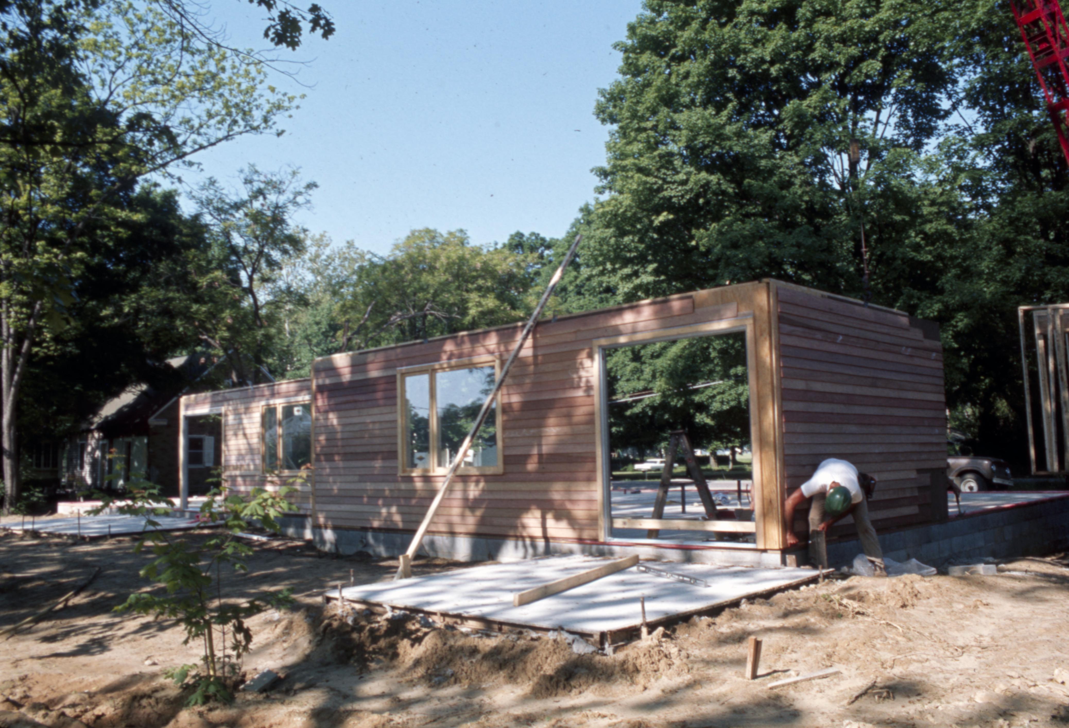 Lanark Development Collection: Construction of 820 Main Street New Harmony Indiana. Men working on the new construction. The house on the far left of the photo was later moved.