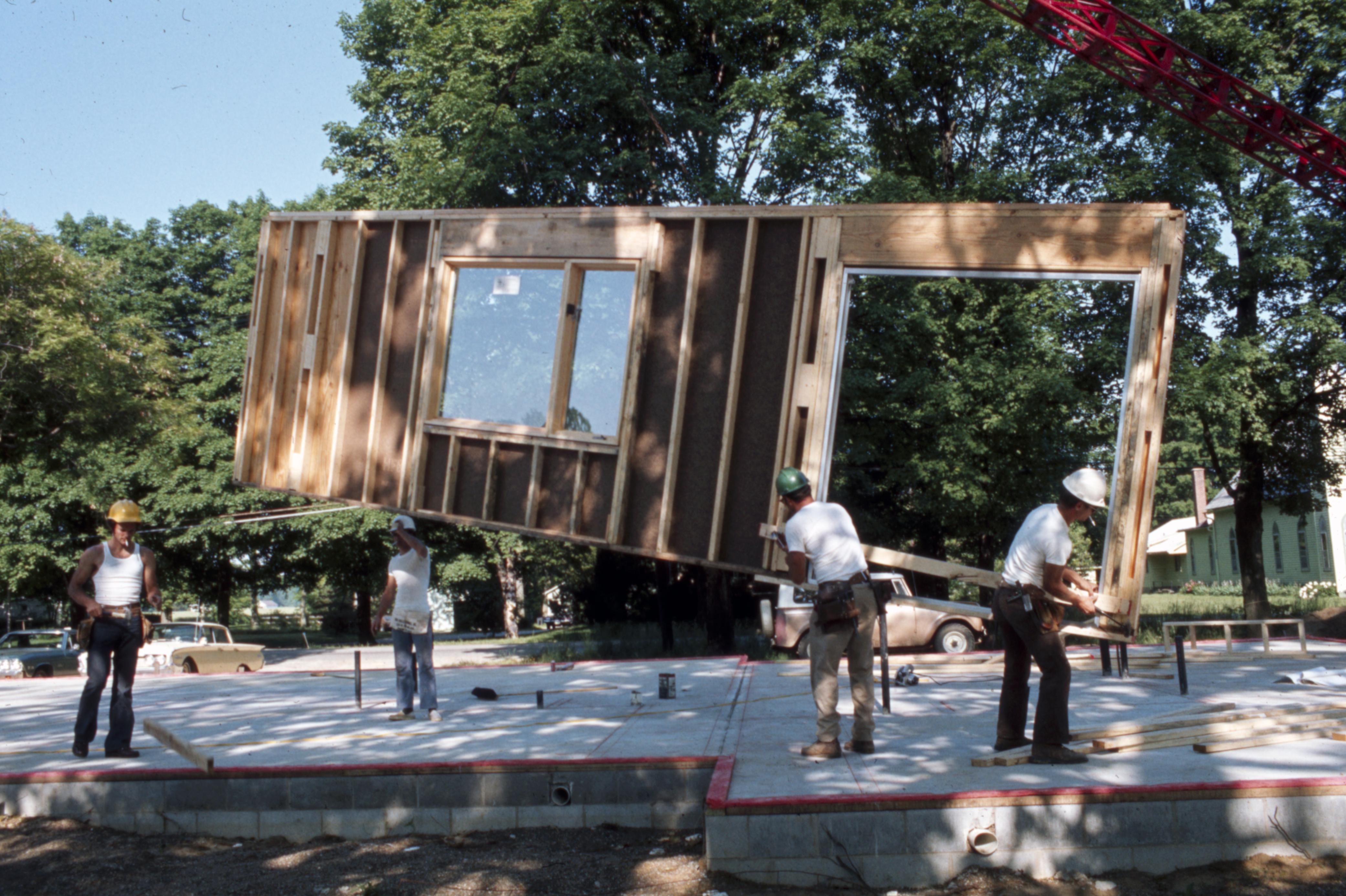 Lanark Development Collection: Construction of 820 Main Street New Harmony Indiana. Men working on the construction of the new building. Holy Angel's Catholic church can be seen across Main Street on the right side of the photo. The car directly behind the workman on the left is a 1960 Ford Galaxie 4 door. The Car on the far left is a 1968 or 1969 Chevy El Camino.