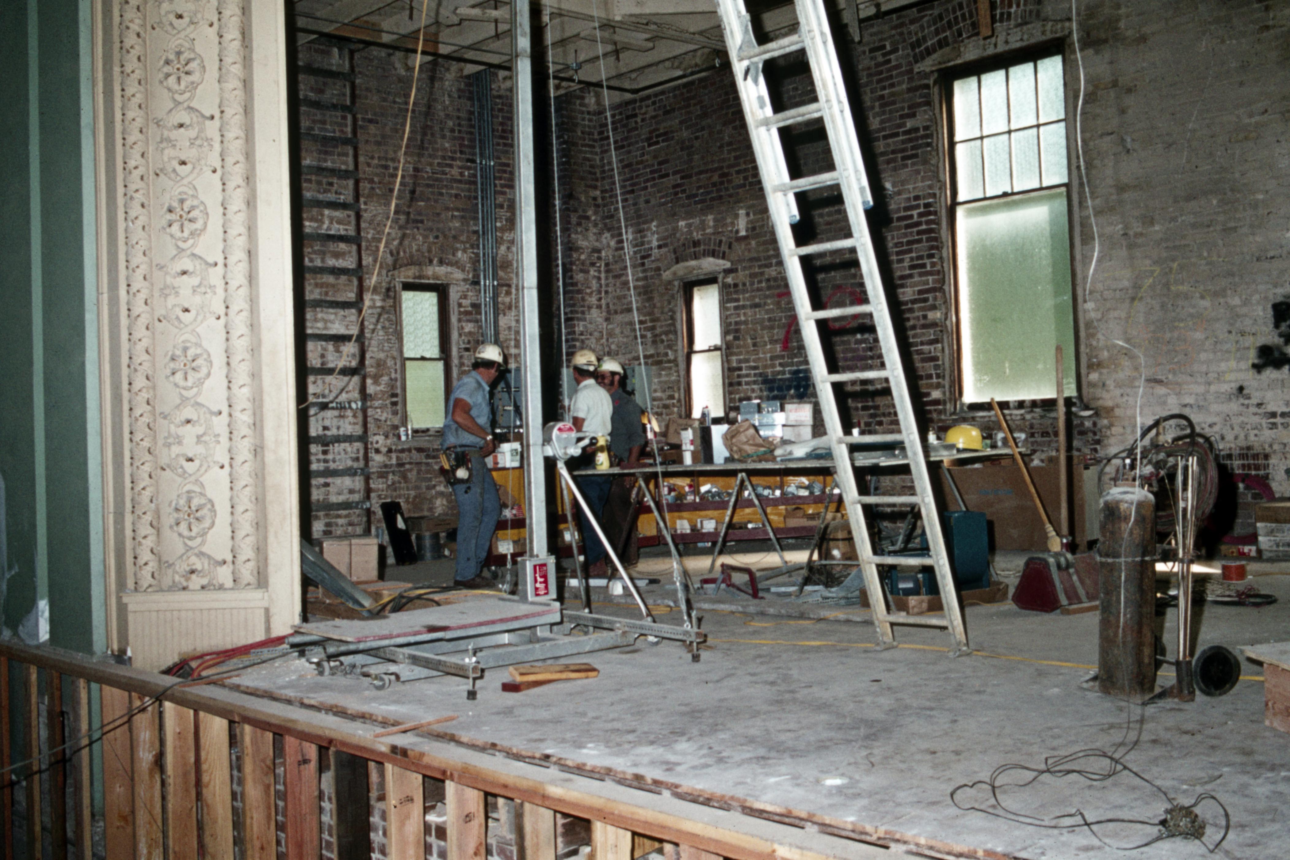 Murphy Auditorium: Murphy Auditorium is located at 419 Tavern Street and was constructed on the plat just east of the Working Men's Institute from 1911 to 1913, using the Doctor Edward Murphy Fund, and was built as part of New Harmony's centennial celebration of 1914. In 2014, the town's bicentennial, Murphy Auditorium became the new home of the concert series Under The Beams, originally housed in the Rapp-Owen Granary. Today, the auditorium is owned by the University of Southern Indiana and is the home of The New Harmony Theater with a seating capacity of 360 people. Refurbish work as it was occurring on the stage of the building.