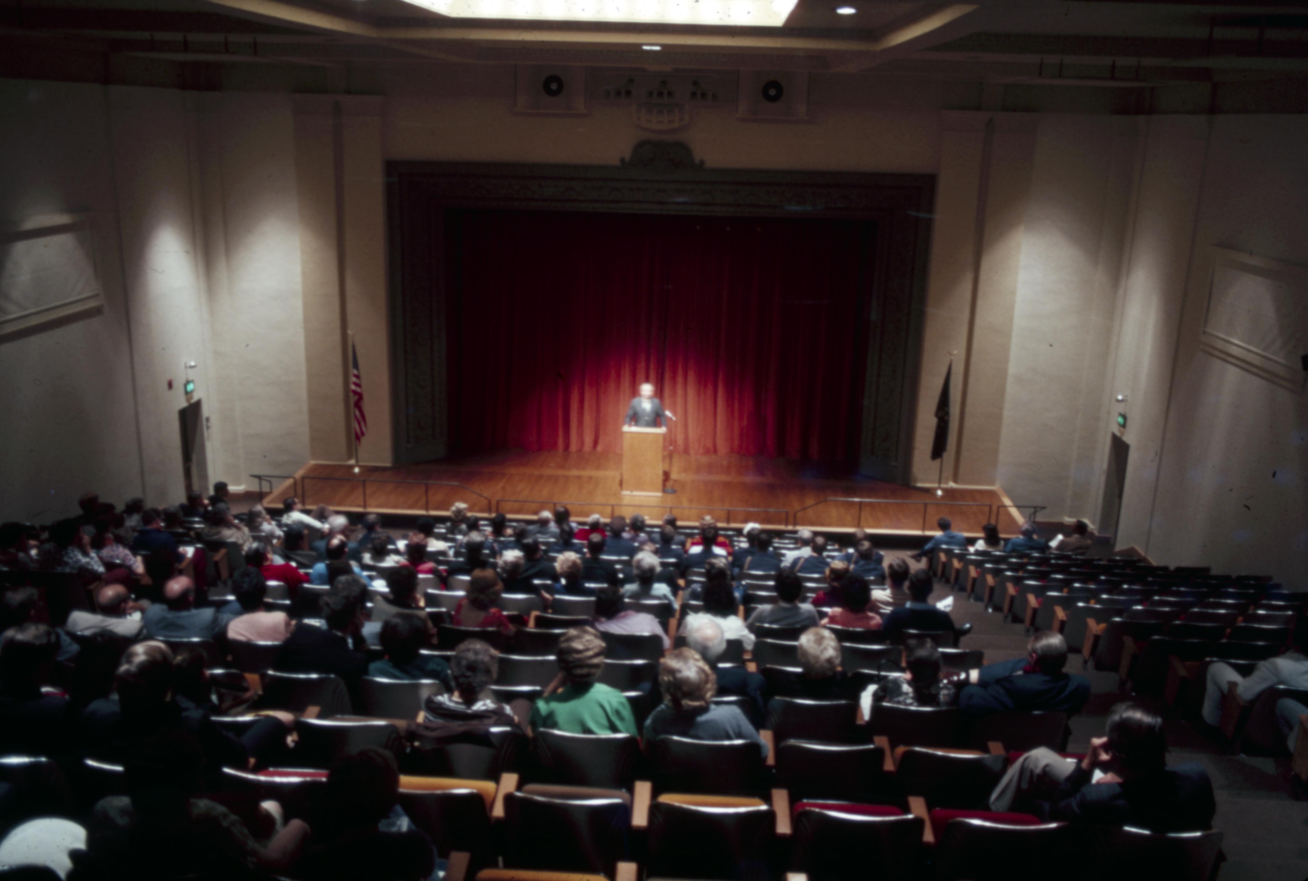 Murphy Auditorium: Murphy Auditorium is located at 419 Tavern Street and was constructed on the plat just east of the Working Men's Institute from 1911 to 1913, using the Doctor Edward Murphy Fund, and was built as part of New Harmony's centennial celebration of 1914. In 2014, the town's bicentennial, Murphy Auditorium became the new home of the concert series Under The Beams, originally housed in the Rapp-Owen Granary. Today, the auditorium is owned by the University of Southern Indiana and is the home of The New Harmony Theater with a seating capacity of 360 people. In this photo a man is giving a speech to a crowd of guests.