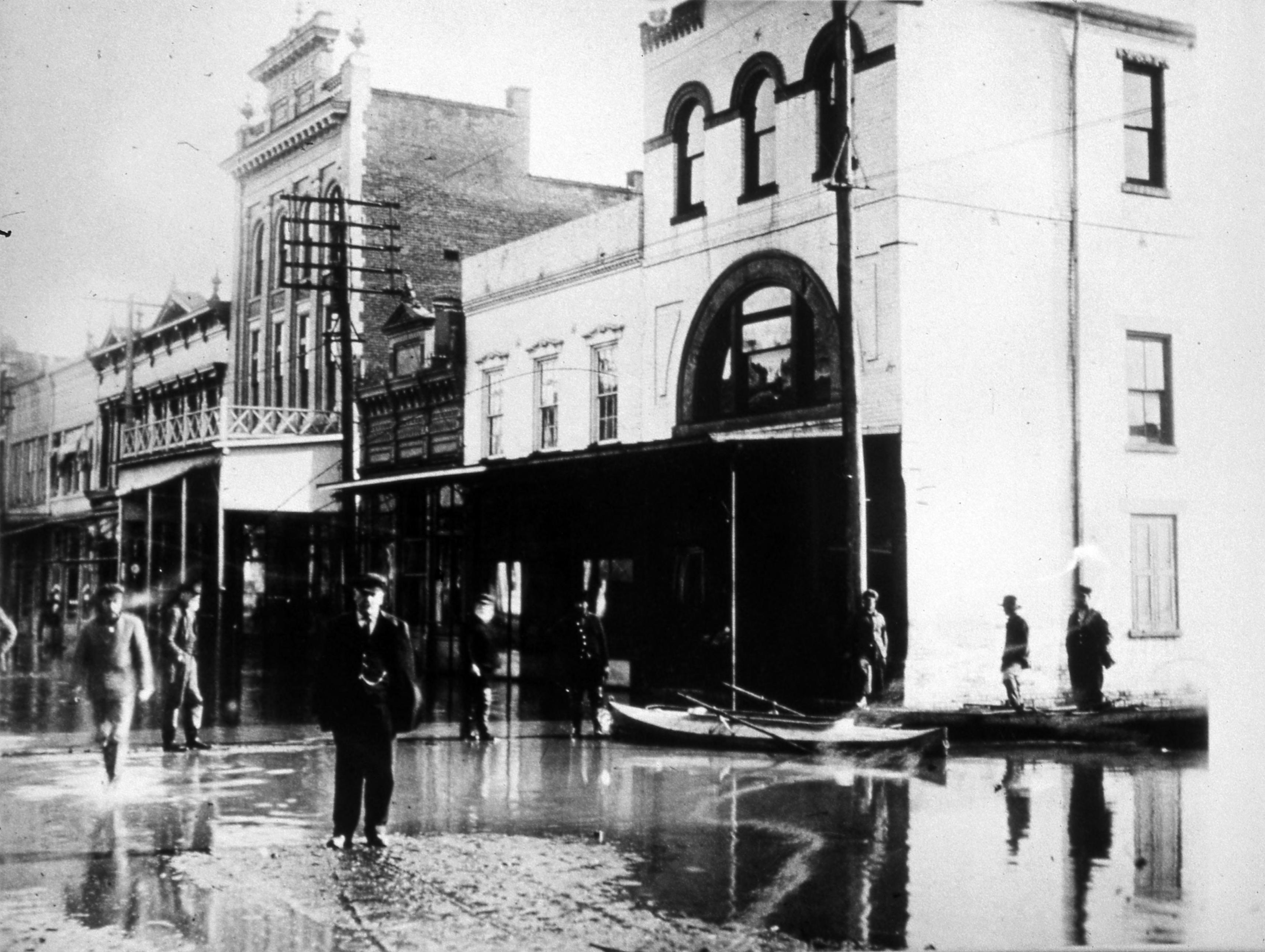 1913 Flood: This historic photo of Main Street, facing north, between Tavern and Church, was probably taken in late March of 1913, at which time the Wabash River had produced a large flood. The building on the far right is located at the corner of Tavern and Main Streets. All of the buildings in this photo are still present to this day (2021).
