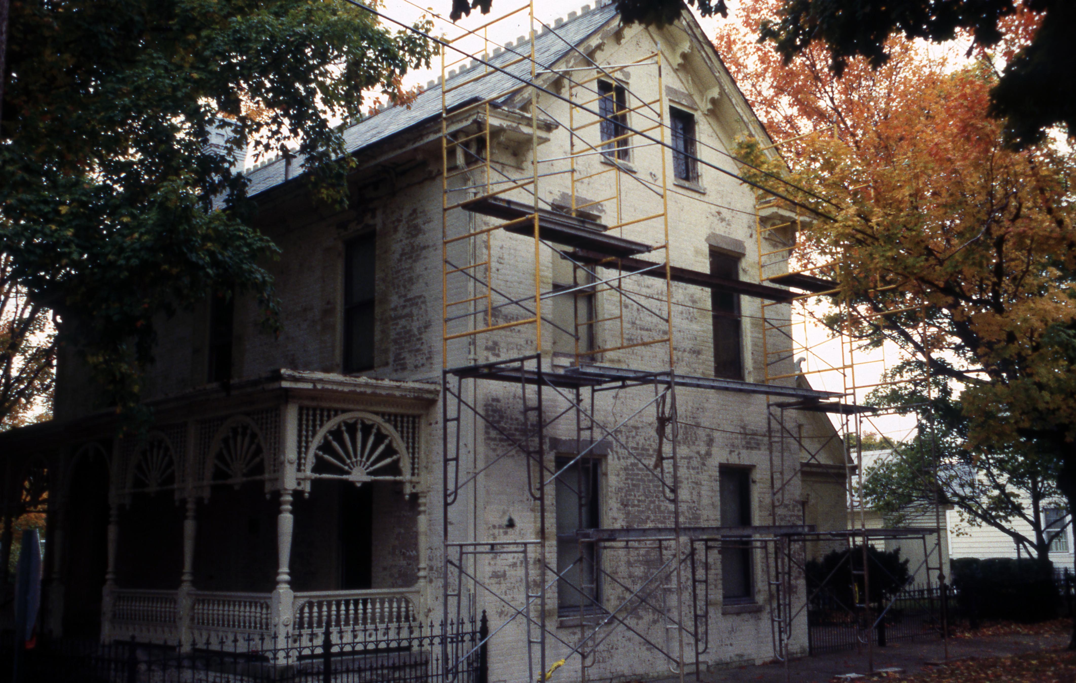 Schnee House: This photo is of the second Schnee home located at 603 West Street and was constructed in 1876. The first Schnee home was constructed during the Rappite occupation of the town, the Schnee brothers having moved to the town from the Quaker colony in Pennsylvania, and that house was located at 517 Tavern Street. The Gypsy Girl Livery Stable was later constructed behind that home. In this photo the house is being prepped for repainting. Scaffolding has been constructed on the north wall which faces Tavern Street. The photo was probably taken in the late 1990s.