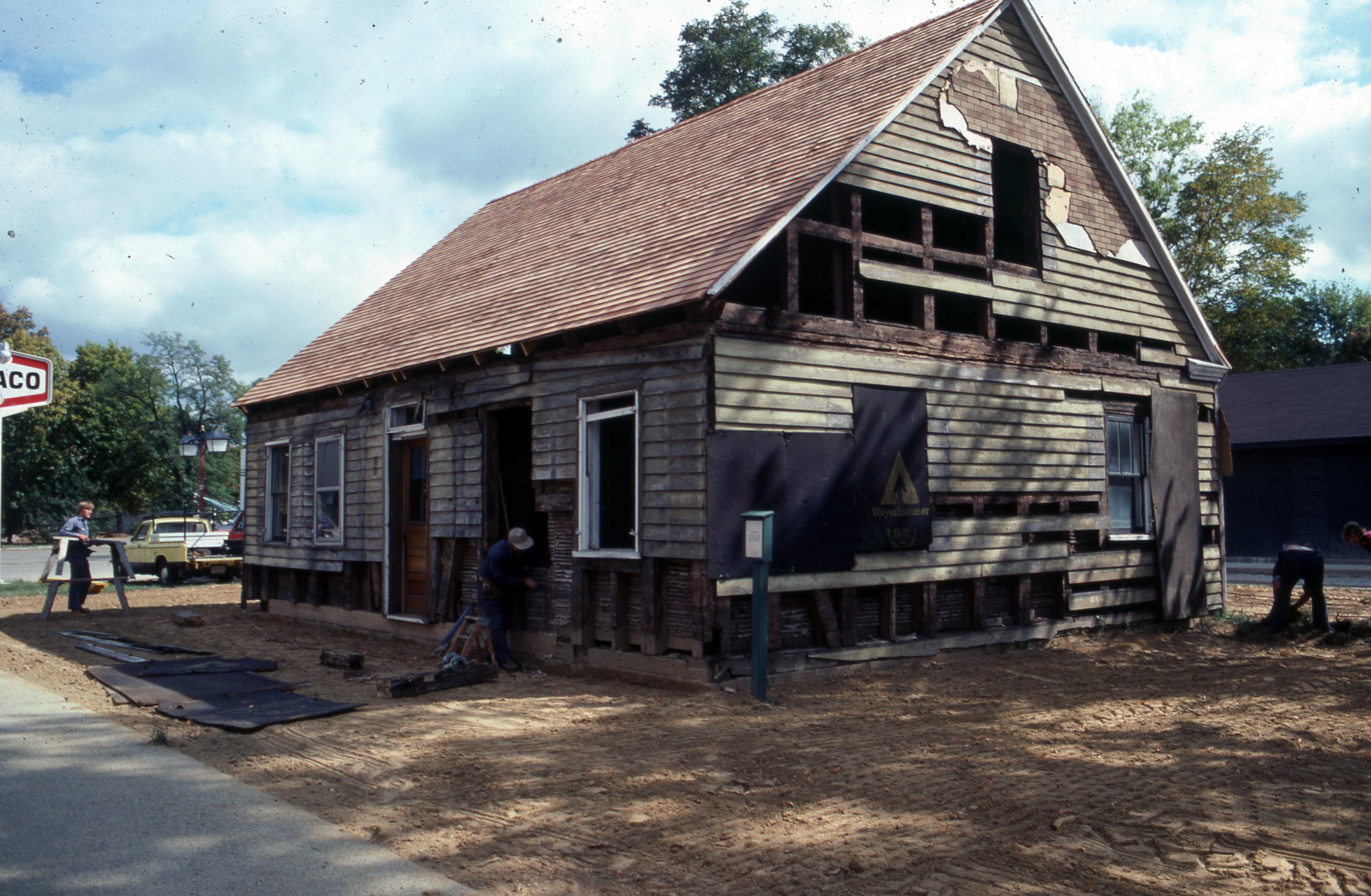 Beal House: The Beal House was moved during the Lanark Construction, on Town Block 8 E/W on Main Street to 611 Church Street. The Beal house was constructed around 1829 by John Beal, who was a carpenter in the Owen and Maclure community. Beal constructed the house from lumber and timbers from an older horse barn. The new location would be the site of the Beal House and 1850s Doctor's Office (The Doctor's Office was a remodel of the Kemmerling House, which was also moved to this site). Elmer Buchta Moving Engineers was contracted for this and many other building moves during the 1970s. This photo shows the house as the old clapboards were being removed.