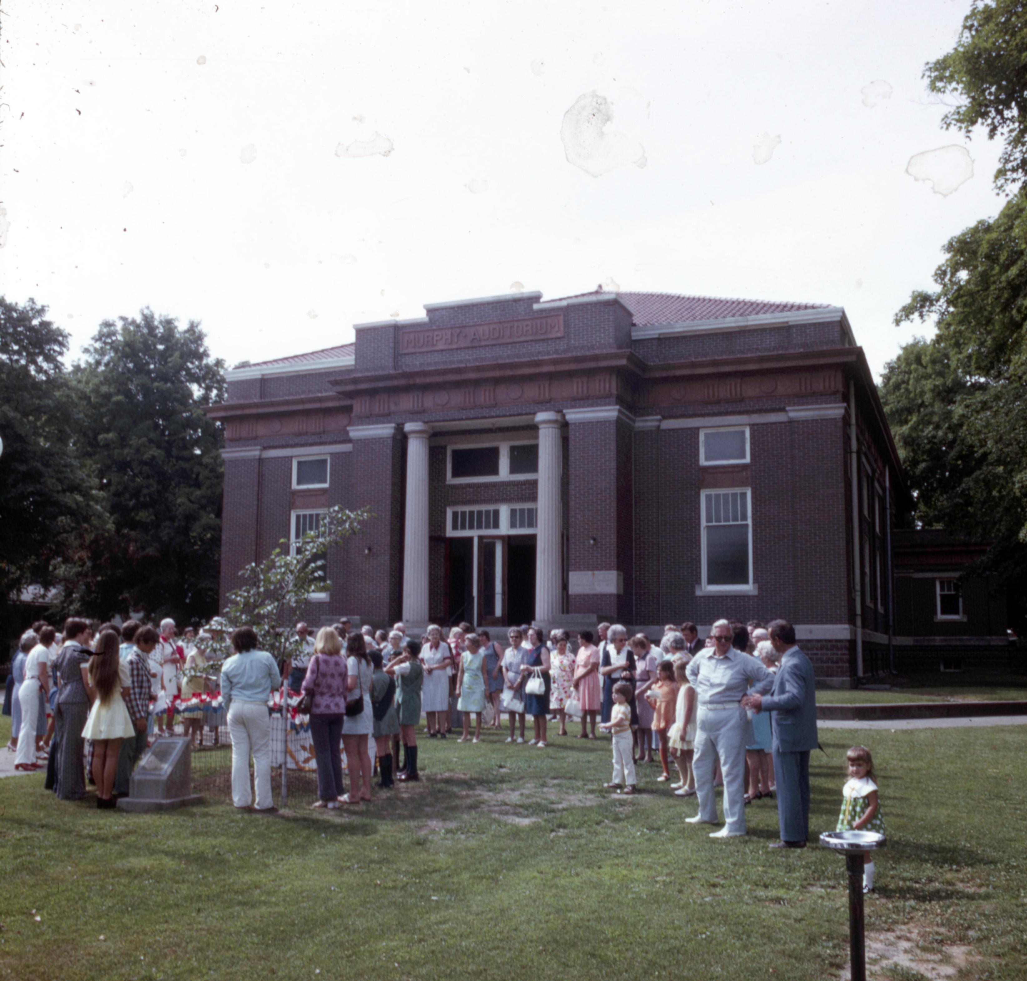 Guild Of Guides: The New Harmony chapter of the Indiana Junior Historical Society was called The Guild of Guides. The IJHS was formed in 1938 and this society had chapters, across the state of Indiana, which were formed by junior high and high school students who had an interest in historical things. The Guild of Guides produced a paper and photographs, in 1968, titled Architecture In New Harmony, Indiana, 1814 - 1969 which was published in a periodical produced by the IJHS. In this photo the group is standing, for the dedication of a tree, in front of the stone marker set at the front of Murphy Auditorium. This tree is still present in 2021 and is somewhat dislodging the stone marker.