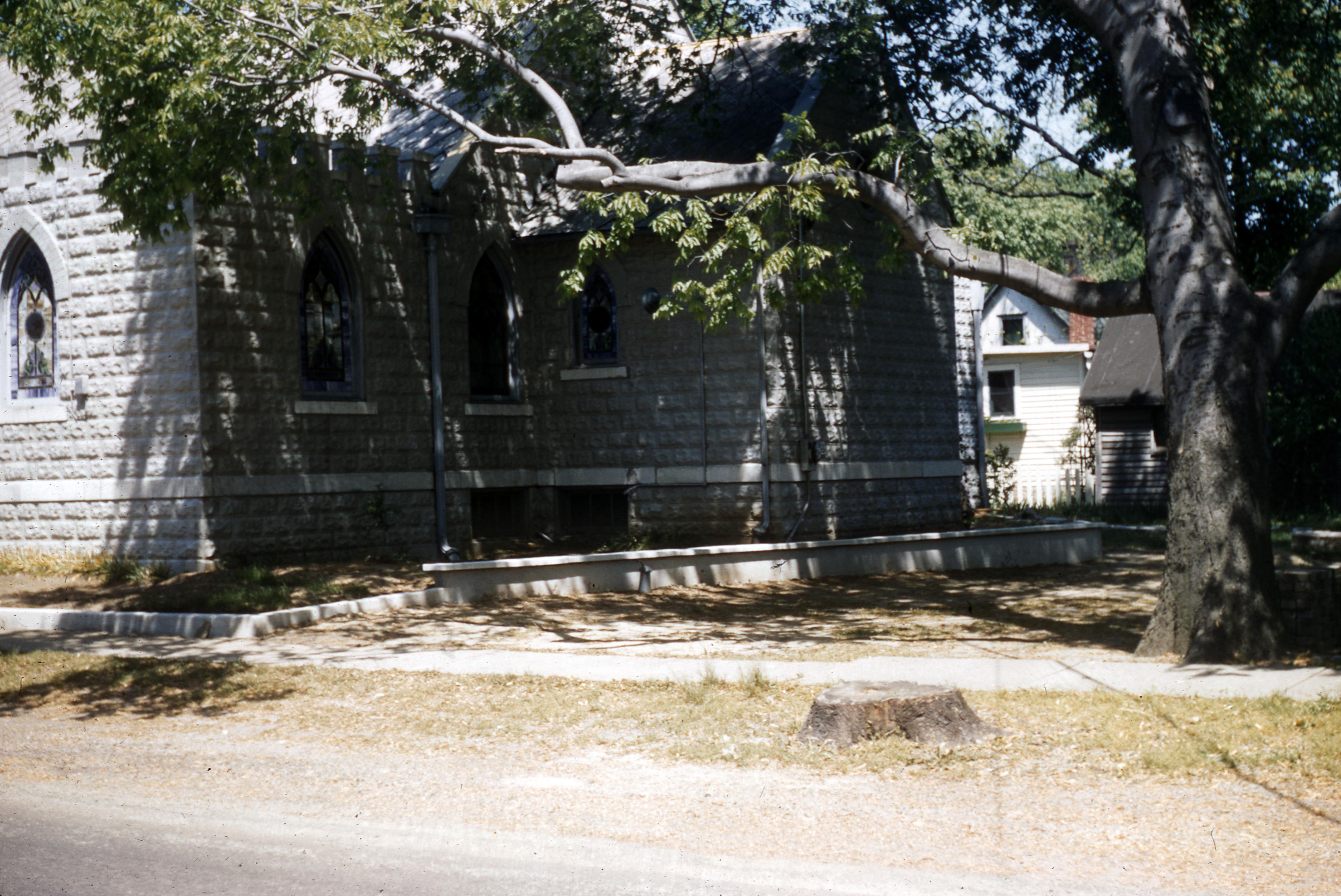 St. Stephen's Episcopal Church: The church was first organized in 1841 and in 1843 the west wing of the old Rappite church was given for use by the Episcopal�s by Alexander and Anne Maclure. At this time the old burial ground was also given to the church, which was bought back by the Rappites in 1846. Then in 1850 the Episcopal�s sold the west wing of the old Rappite Church for $1000 and in 1854 St. Stephen�s Church was constructed, the North Street location where the Lenz House now resides.1888 saw the construction of a new belfry add to the church to accommodate the new bell. In 1911 the new church was built, and an addition was made to it in 1927. The church is still present as of 2022. This photo shows the yard behind the church before renovations were made.