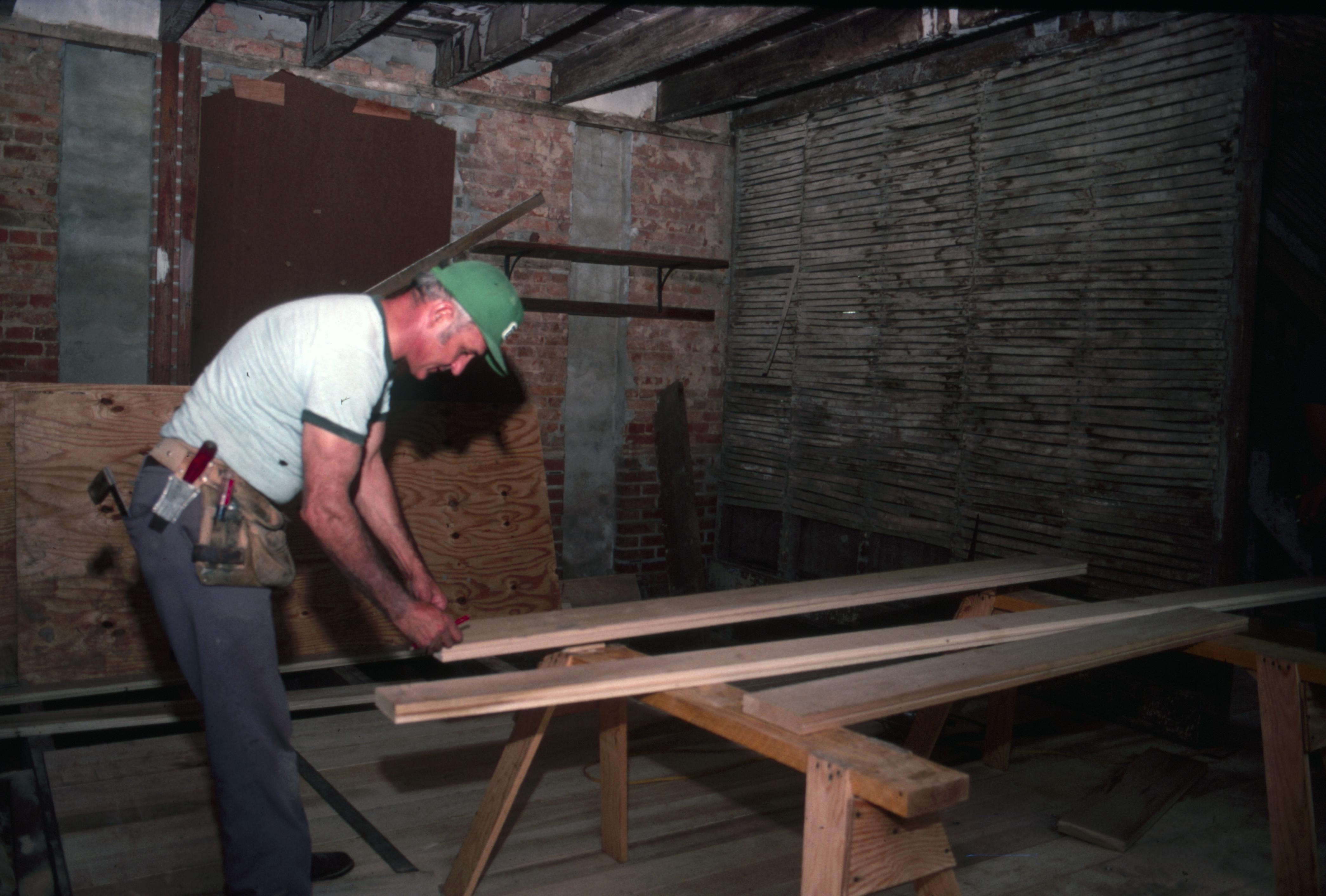 1830 Owen House: A construction worker is cutting new tongue and groove flooring inside the 1830 Owen House.