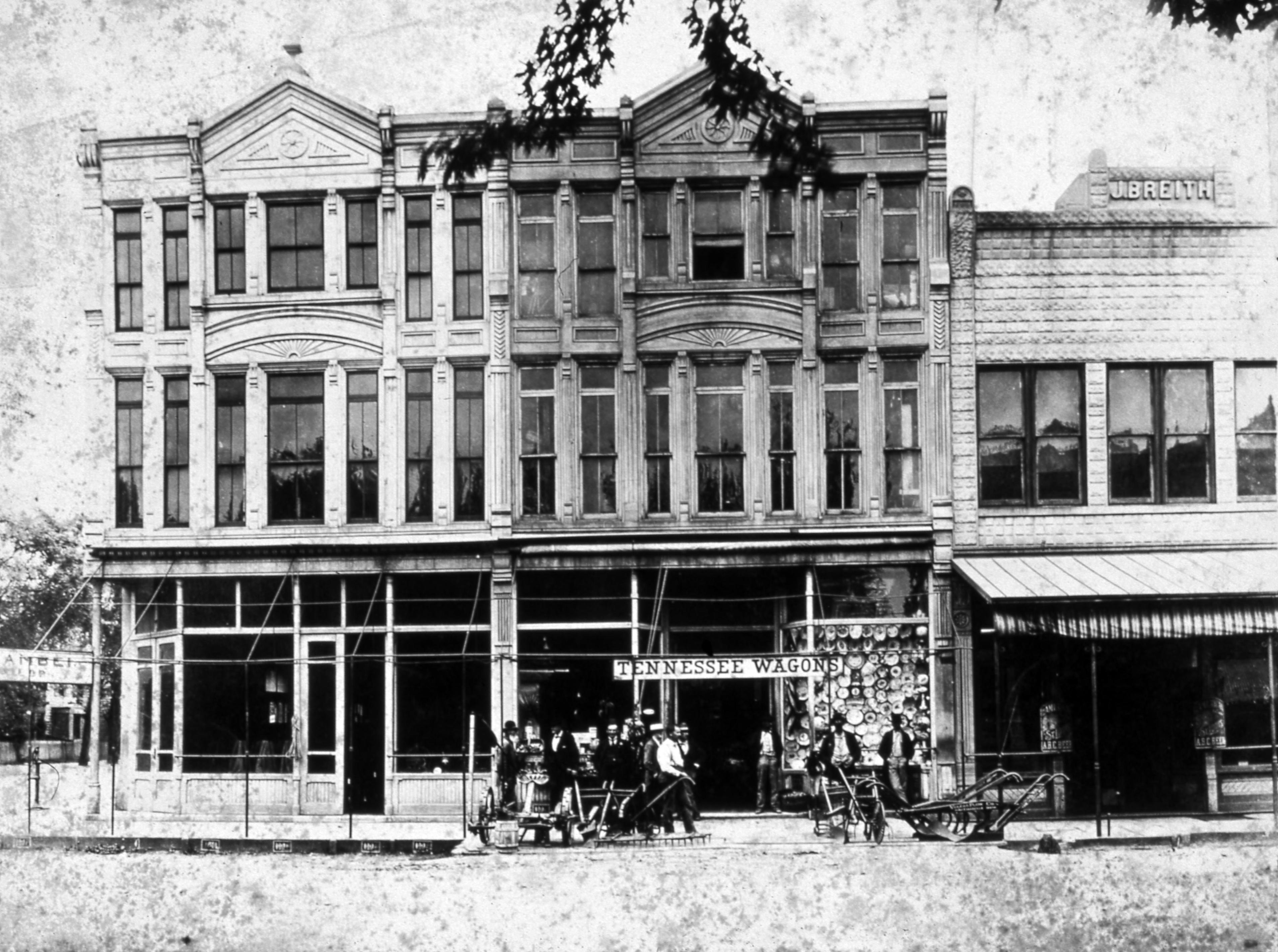 E. F. Owen and Company Store: Located at 502 Main Street, on the southeast corner of Main and Church. This grocery store had been at this location since before 1888 and had persisted until sometime in the late 1890s. This plat belonged to Owen and Company on the 1869 Plat Map and the other side of this building did indeed house a hardware and agricultural implements store. In all probability, this was the location of E. F. Owen and Company. By the mid to late 1890�s the Owen grocery store had been replaced with a clothing store, which only lasted a short time and was in turn replaced by Armstrong�s Place Saloon by 1907 at the latest. A large group of men are gathered in front of the hardware store side. The building on the left was later remodeled and faced with stone when it became New Harmony Bank and Trust Company which opened its doors on September 2, 1920 and closed for good on January 1, 1975. The J Breith Building can be seen on the far right.