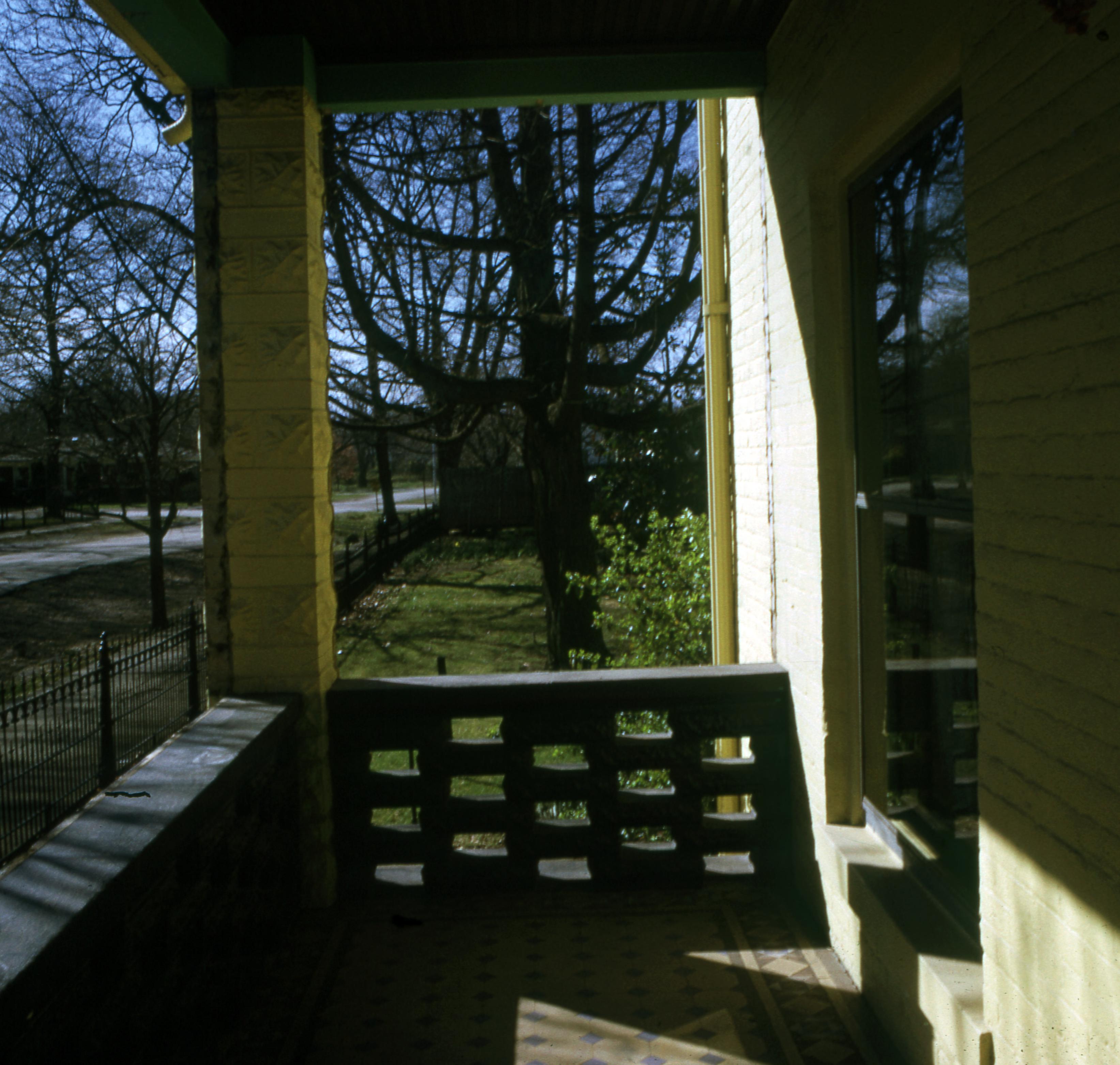 Schnee House: This photo is of the second Schnee home located at 603 West Street and was constructed in 1876. The first Schnee home was constructed during the Rappite occupation of the town, the Schnee brothers having moved to the town from the Quaker colony in Pennsylvania, and that house was located at 517 Tavern Street. The Gypsy Girl Livery Stable was later constructed behind that home. This photo shows the front porch, on the east wall of the home, from on the porch itself. The color mosaic tile floor is clearly visible in this photo.
