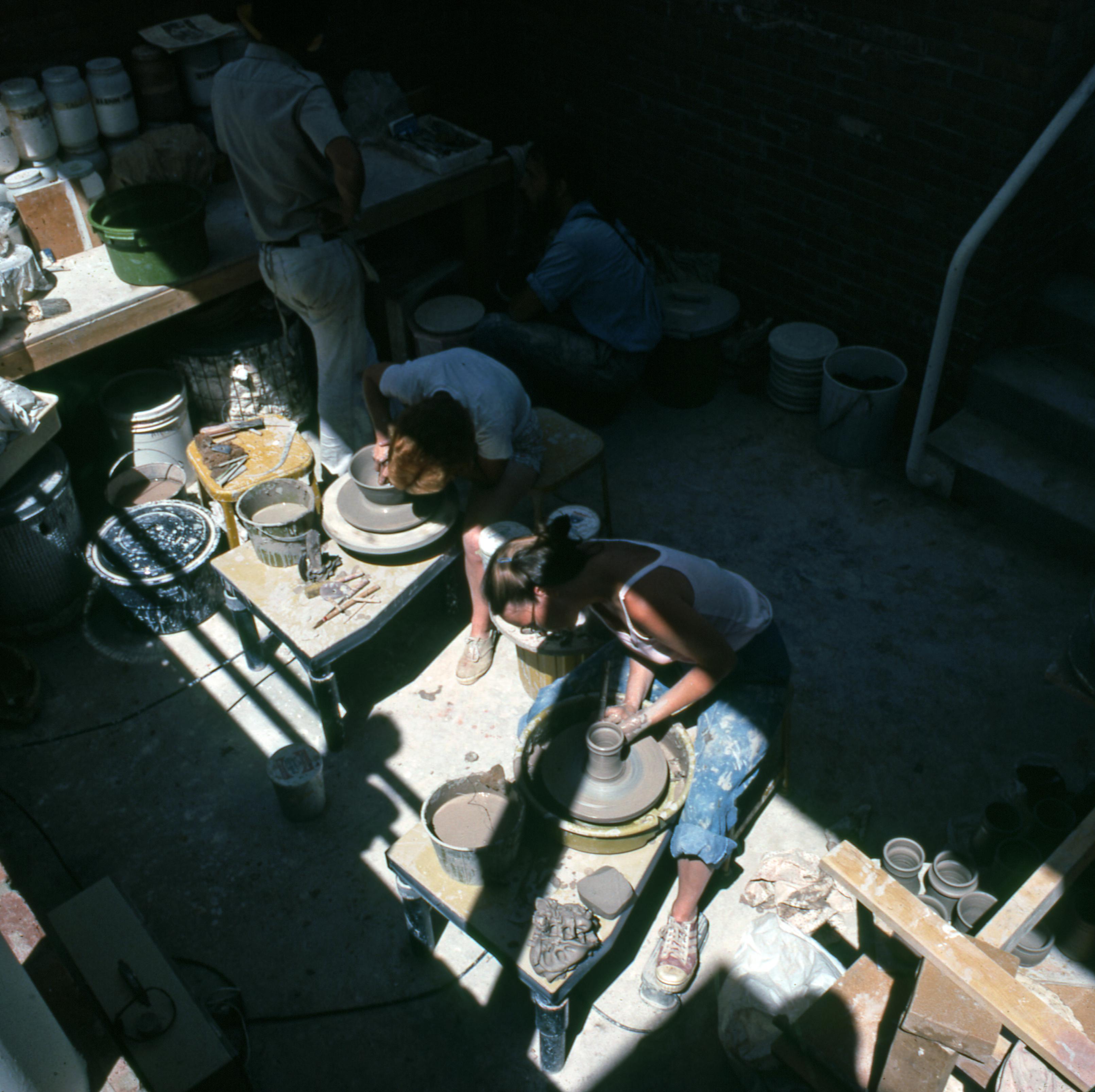 Pottery class working inside the Sarah Campbell Blaffer Potter�s Cabin. The cabin was constructed by Jane Blaffer Owen in honor of her mother, Sarah Campbell Blaffer. The cabin is located at 402.