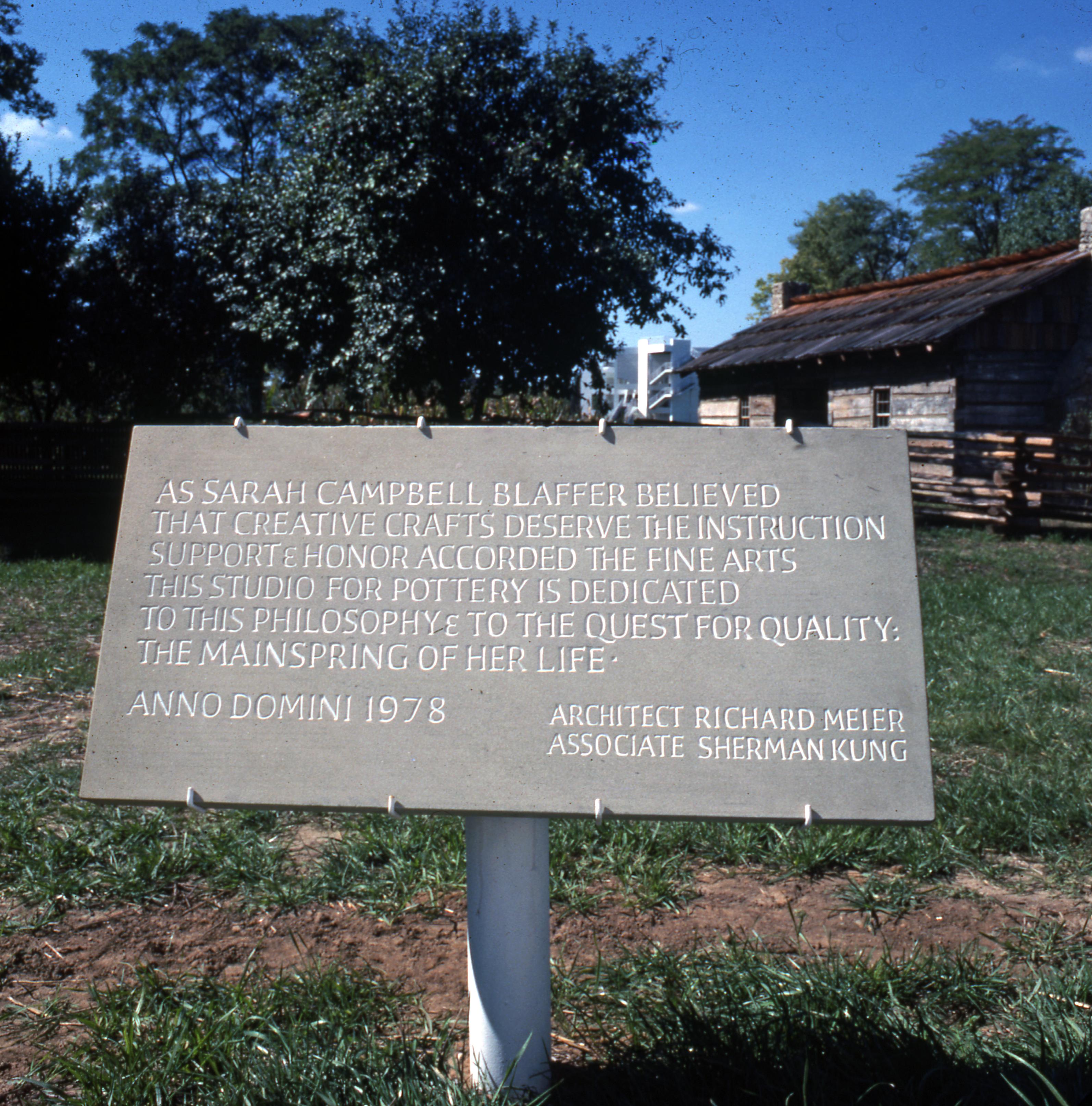 Dedication of the Sarah Campbell Blaffer Potter�s Cabin. The cabin was constructed by Jane Blaffer Owen in honor of her mother, Sarah Campbell Blaffer. The cabin is located at 402.