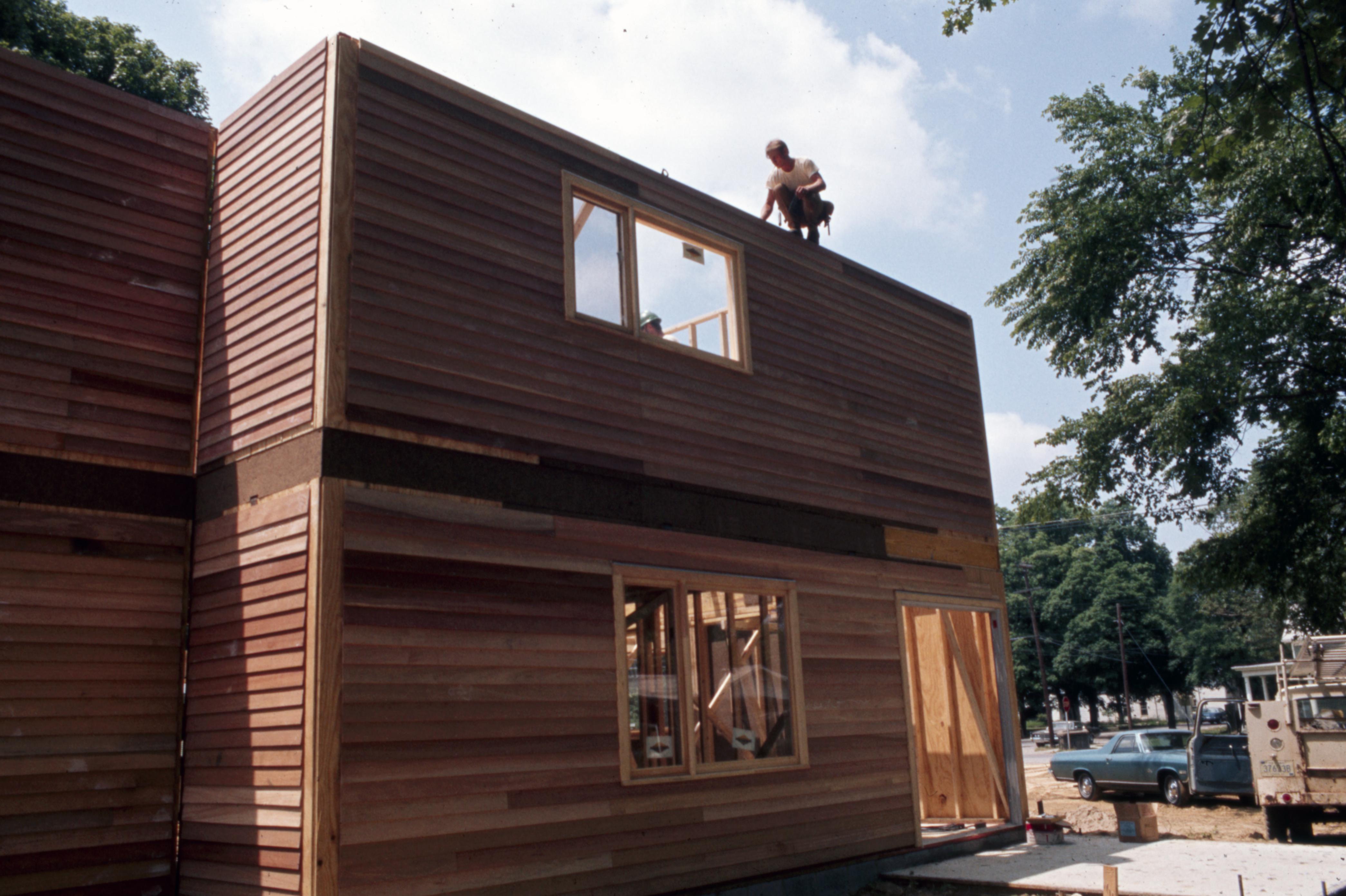 Lanark Development Collection: Construction of 820 Main Street New Harmony Indiana. Men working on the new construction. Construction of the second story. The car between the new construction and the work truck is a 1968 or 1969 Chevy El Camino.