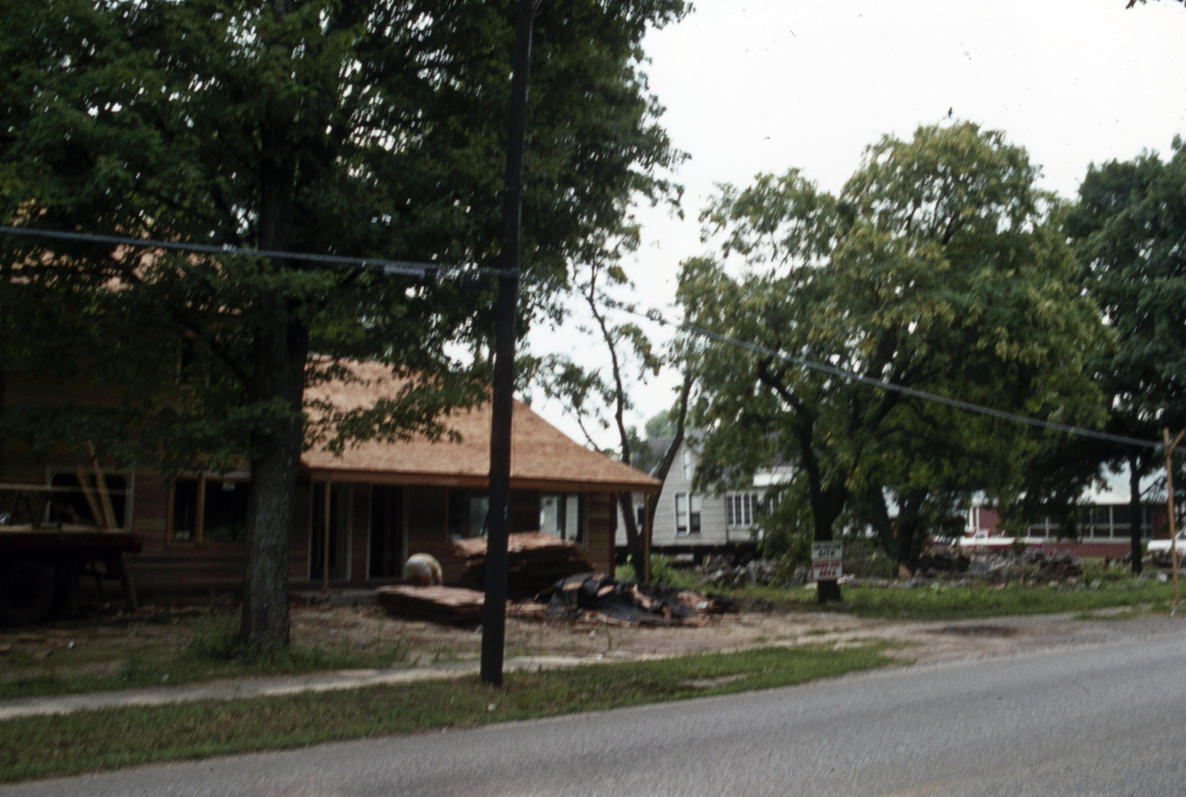 Barrett House Move: This house was originally located at 1826 Main Street but was then moved to 604 South Street during the Lanark Construction. The Barrett House jacked up and ready for the move. The Lanark Construction can be seen on the left side of the photo. Elmer Buchta were the movers.