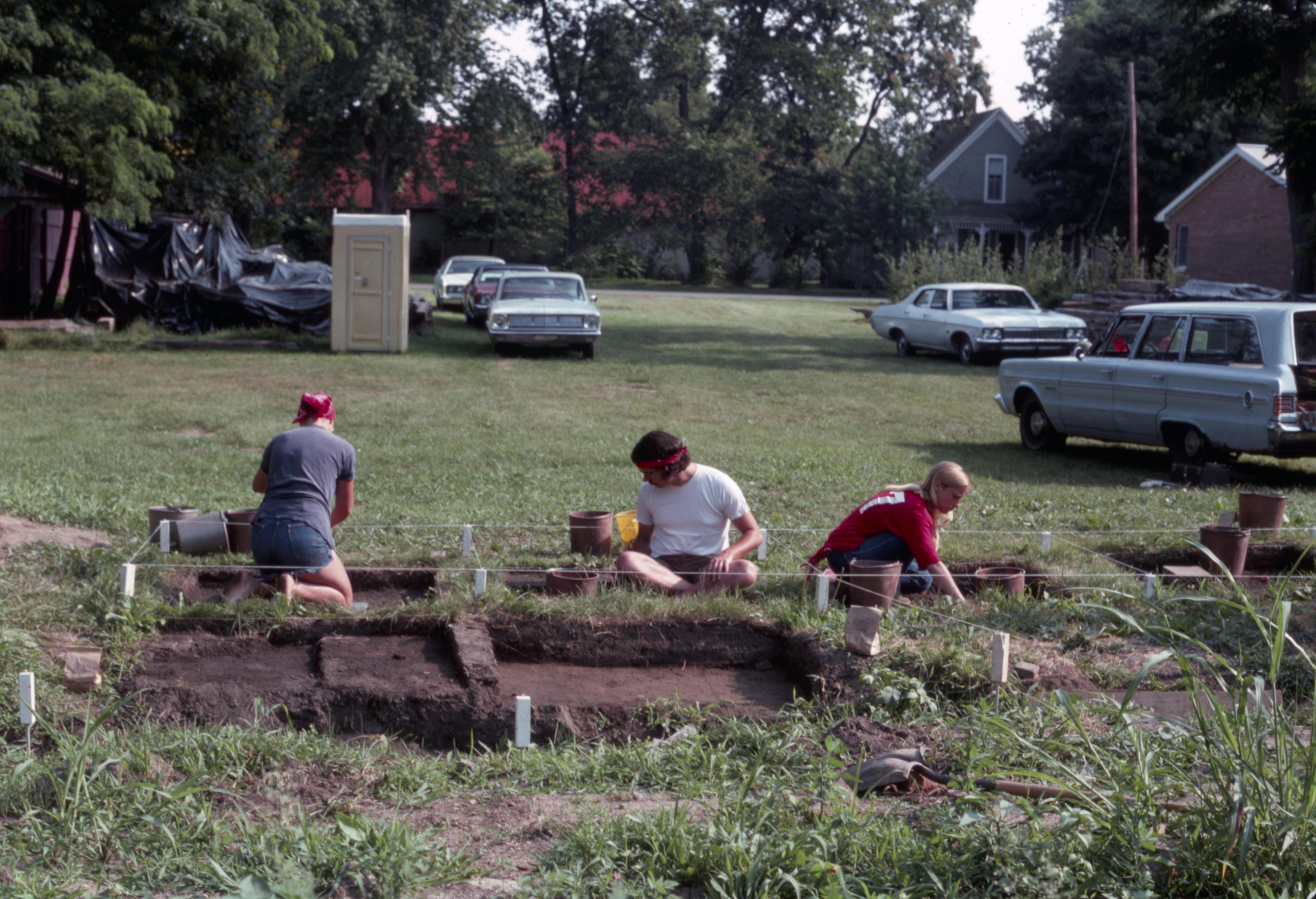 Indiana State University Evansville Archaeological Dig Collection: Solomon Wolf House. This dig site was located on South Street just east of 718 Main Street. This building was moved to 601 Granary Street for the construction of the Tree of Life Clinic. A group of people are working at the dig site.