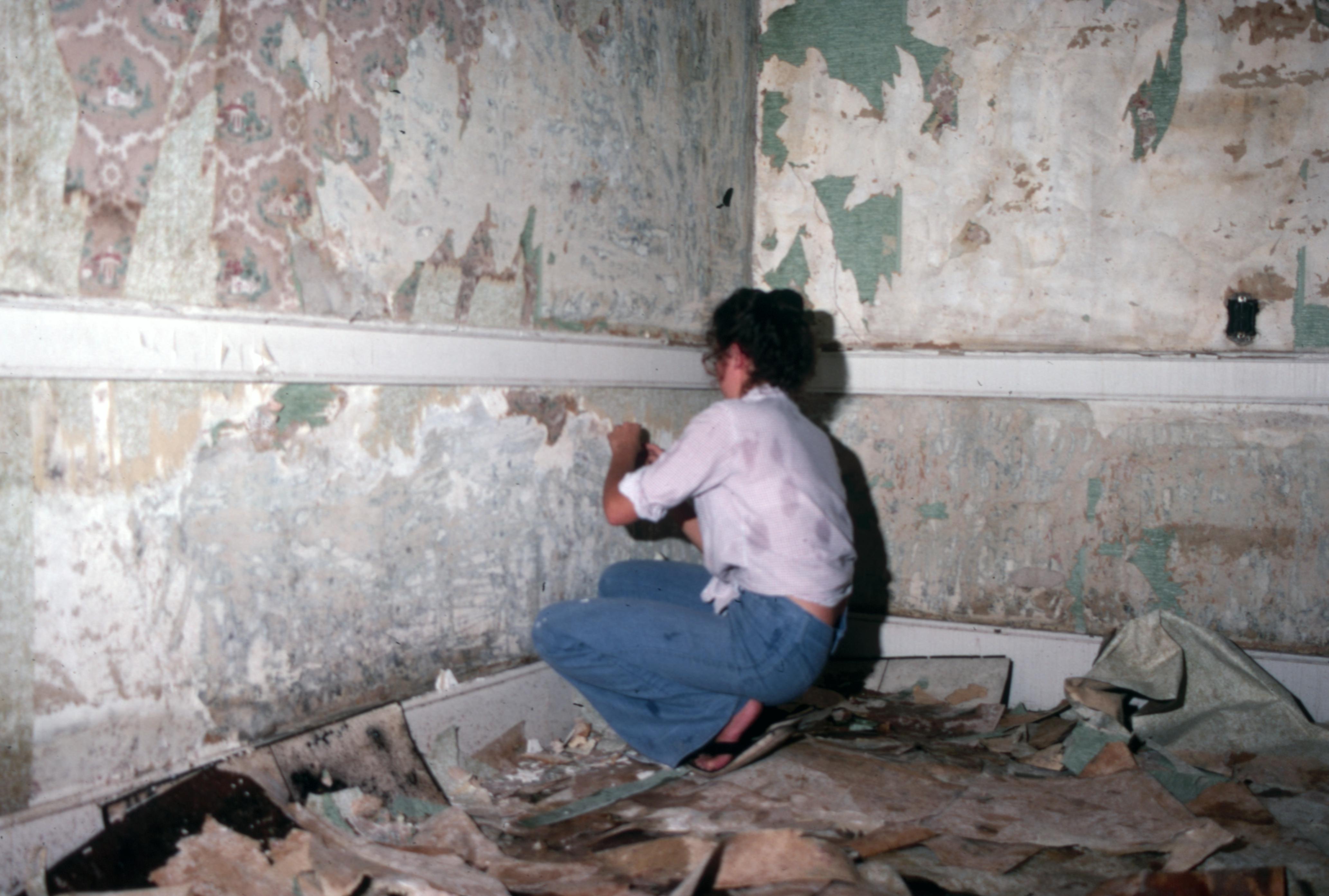 The Jaquess House: This is a photo of the Jaquess House, from which the parlor was taken, was moved from somewhere near Poseyville. It was then taken through a field to near the edge of a highway where it was dismantled. The parlor was then incorporated into the Owen House on the corner of Tavern and Brewery Streets in town block 6 E east. In this photo a woman is removing layers of wallpaper from one of the rooms.
