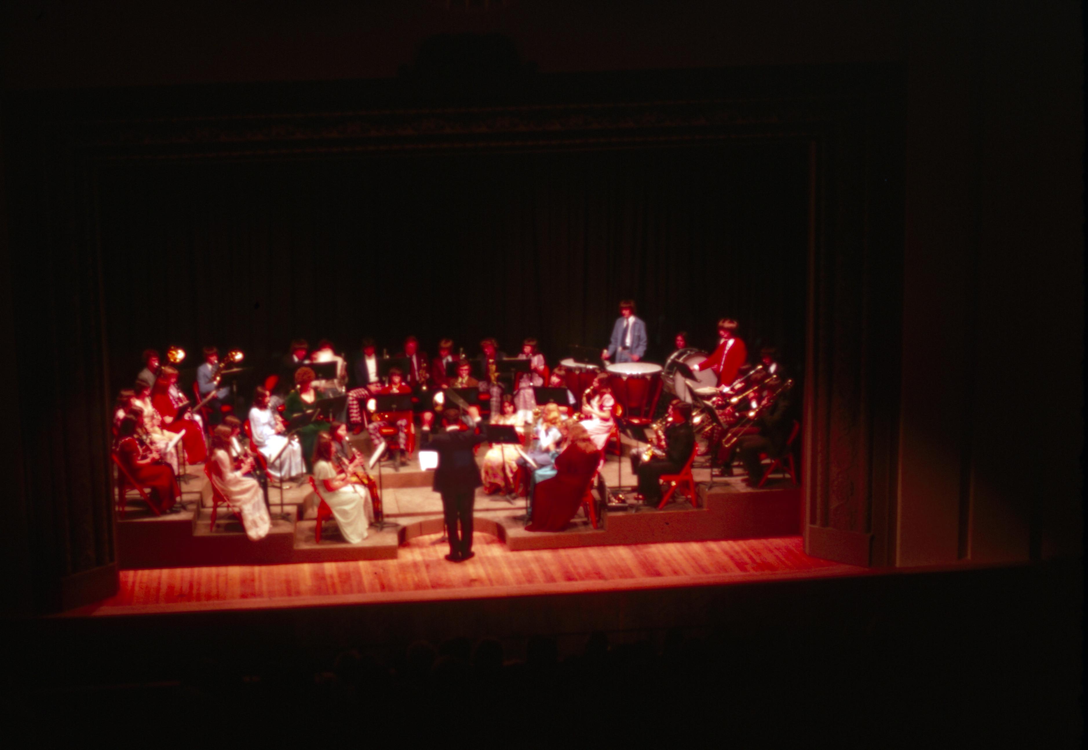 Murphy Auditorium: Murphy Auditorium is located at 419 Tavern Street and was constructed on the plat just east of the Working Men's Institute from 1911 to 1913, using the Doctor Edward Murphy Fund, and was built as part of New Harmony's centennial celebration of 1914. In 2014, the town's bicentennial, Murphy Auditorium became the new home of the concert series Under The Beams, originally housed in the Rapp-Owen Granary. Today, the auditorium is owned by the University of Southern Indiana and is the home of The New Harmony Theater with a seating capacity of 360 people. This photo appears to be a group of young people, possibly from New Harmony School, play a concert for the filled auditorium.