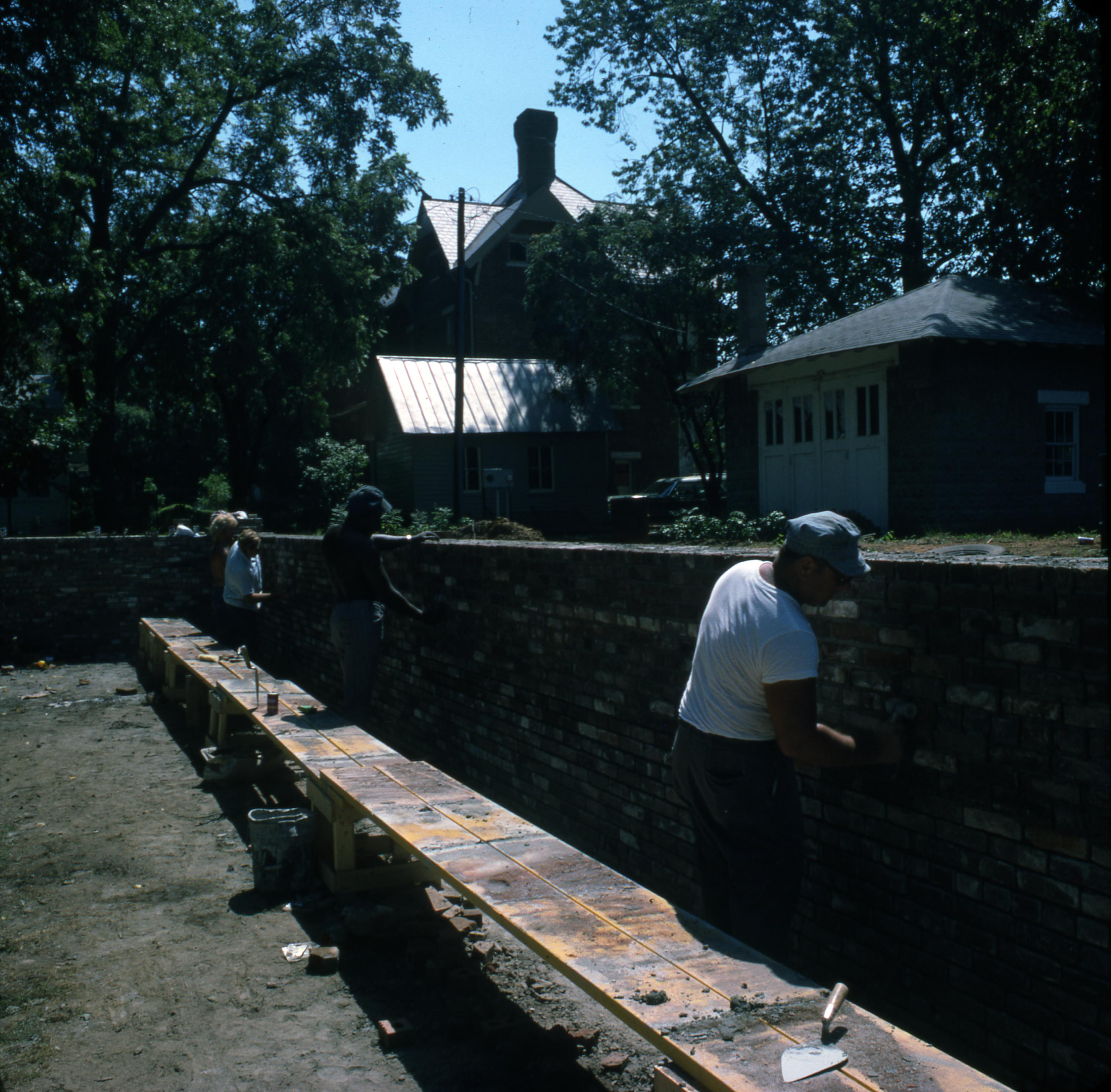 The repairing of the brick wall surrounding the cemetery. The Harmonist Cemetery located at the end of Granary and West Street. The cemetery was originally located in part of the Harmonist orchard and was fenced in with a brick wall in 1874. Located within the wall are at least 20 Middle Woodland Period mounds most likely of the Hopewell people. The property is maintained by the Indiana State Museum and Historic Sites.