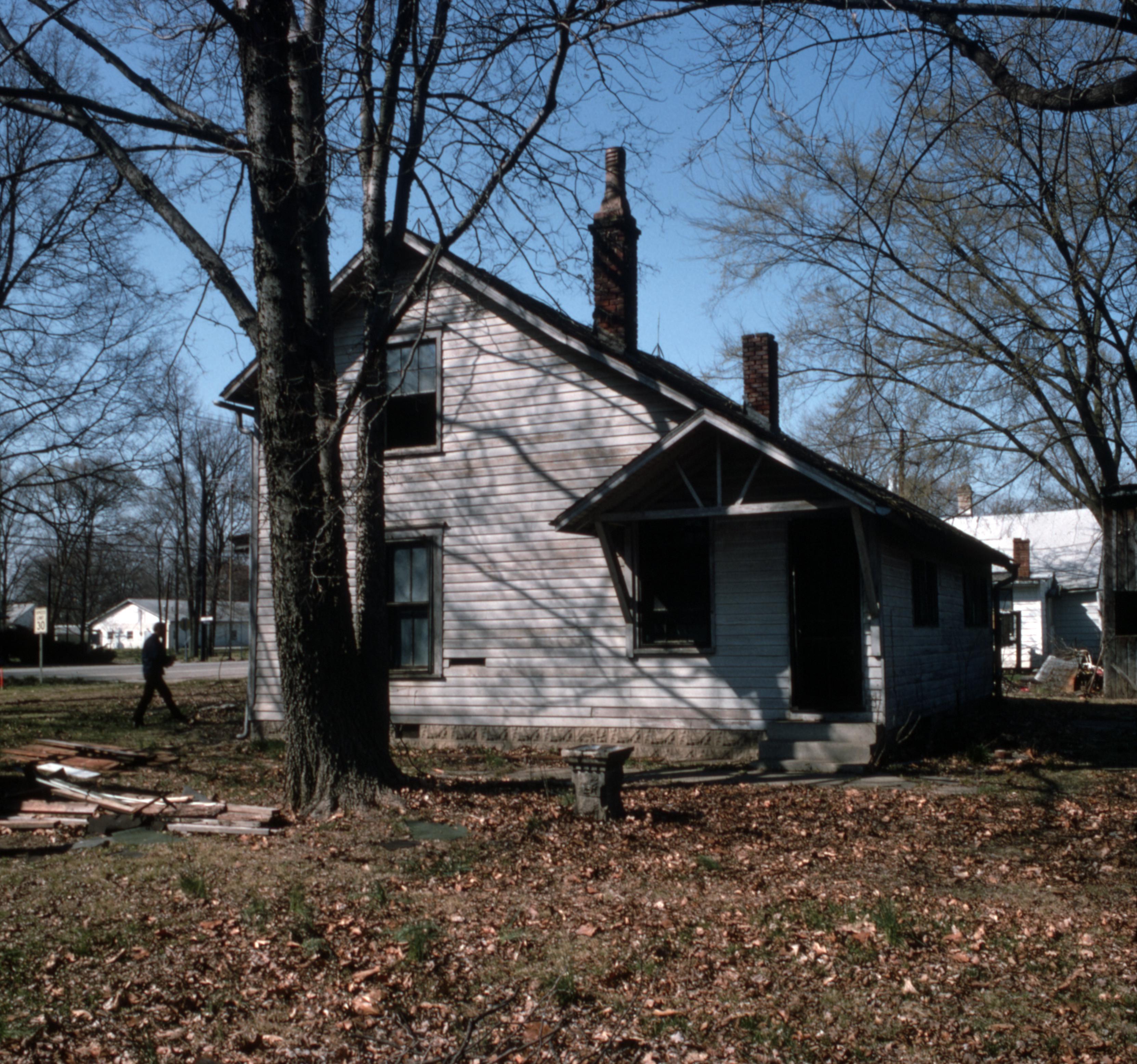 Lanark Development Collection: Buildings which were demolished during the construction of 820 Main Street New Harmony Indiana. This dwelling belonged to F. Arnoldy whose cooper shop, aka the blacksmith and wagon shop, stood to the left of the house. Part of the original shop can still be seen on the far right of the photo.