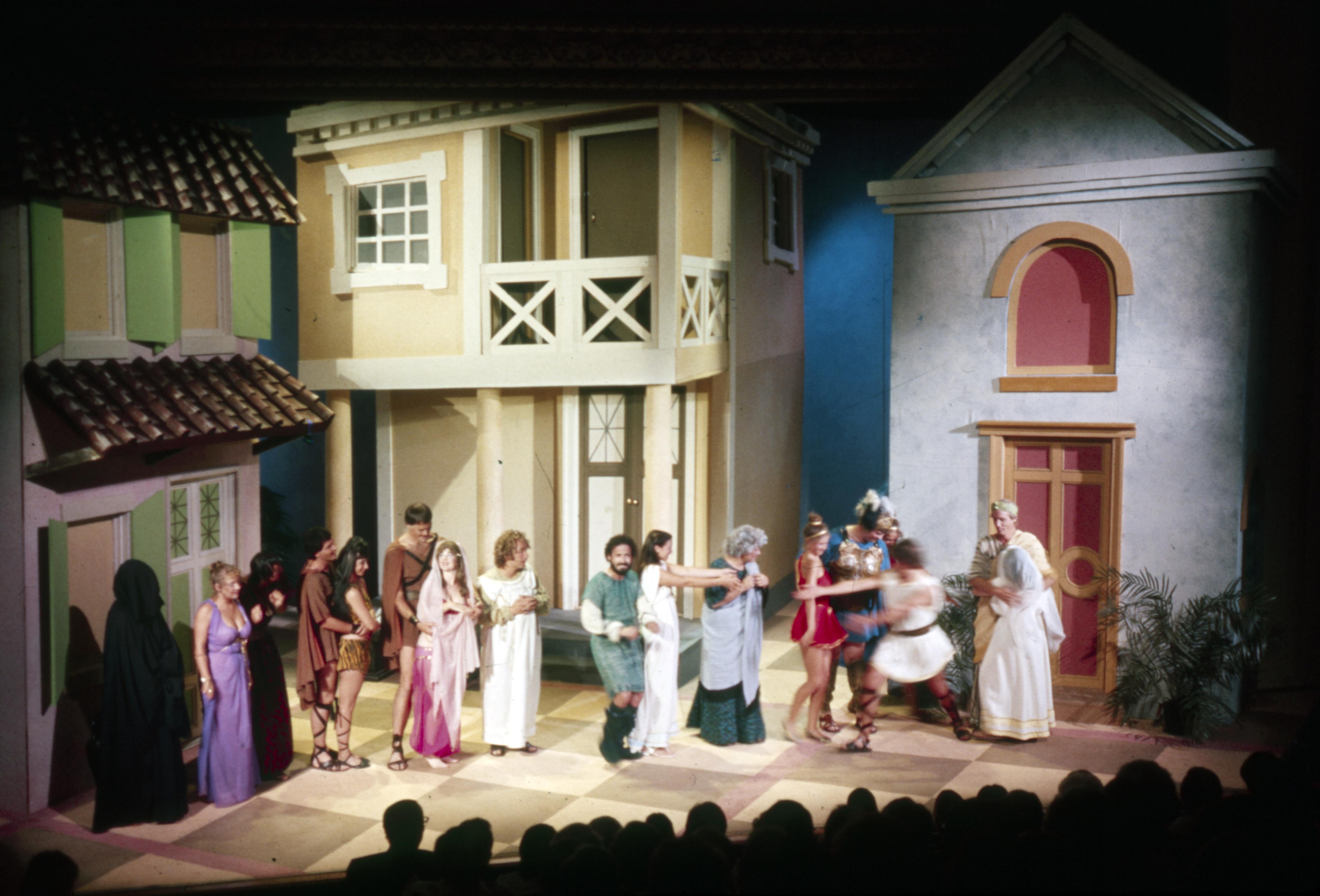 Murphy Auditorium: Murphy Auditorium is located at 419 Tavern Street and was constructed on the plat just east of the Working Men's Institute from 1911 to 1913, using the Doctor Edward Murphy Fund, and was built as part of New Harmony's centennial celebration of 1914. In 2014, the town's bicentennial, Murphy Auditorium became the new home of the concert series Under The Beams, originally housed in the Rapp-Owen Granary. Today, the auditorium is owned by the University of Southern Indiana and is the home of The New Harmony Theater with a seating capacity of 360 people. This photo is from a play depicting the Roman or Grecian classical world.