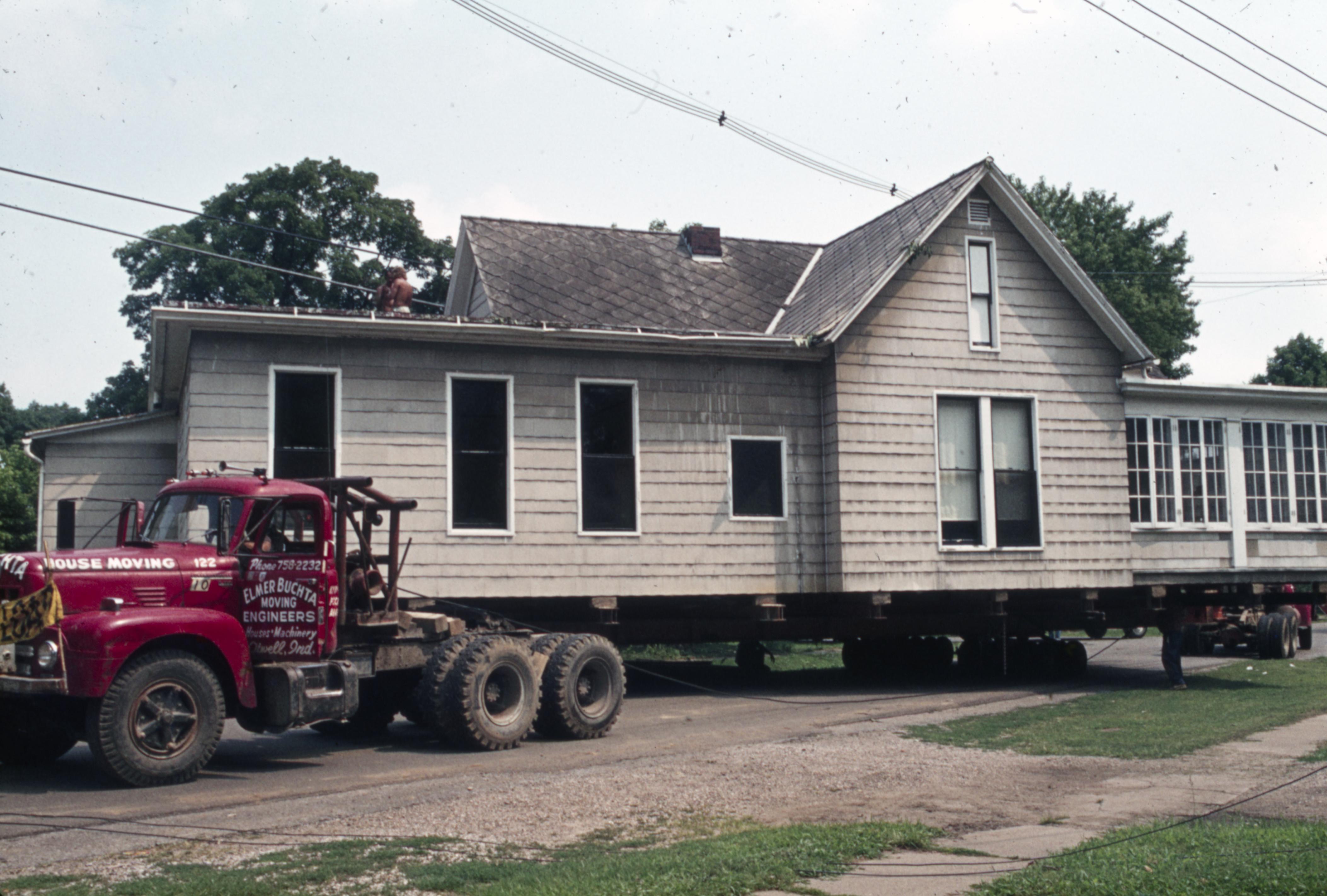 Barrett House Move: This house was originally located at 1826 Main Street but was then moved to 604 South Street during the Lanark Construction. Elmer Buchta were the movers. The movers making the turn onto the 604 South Street plat.