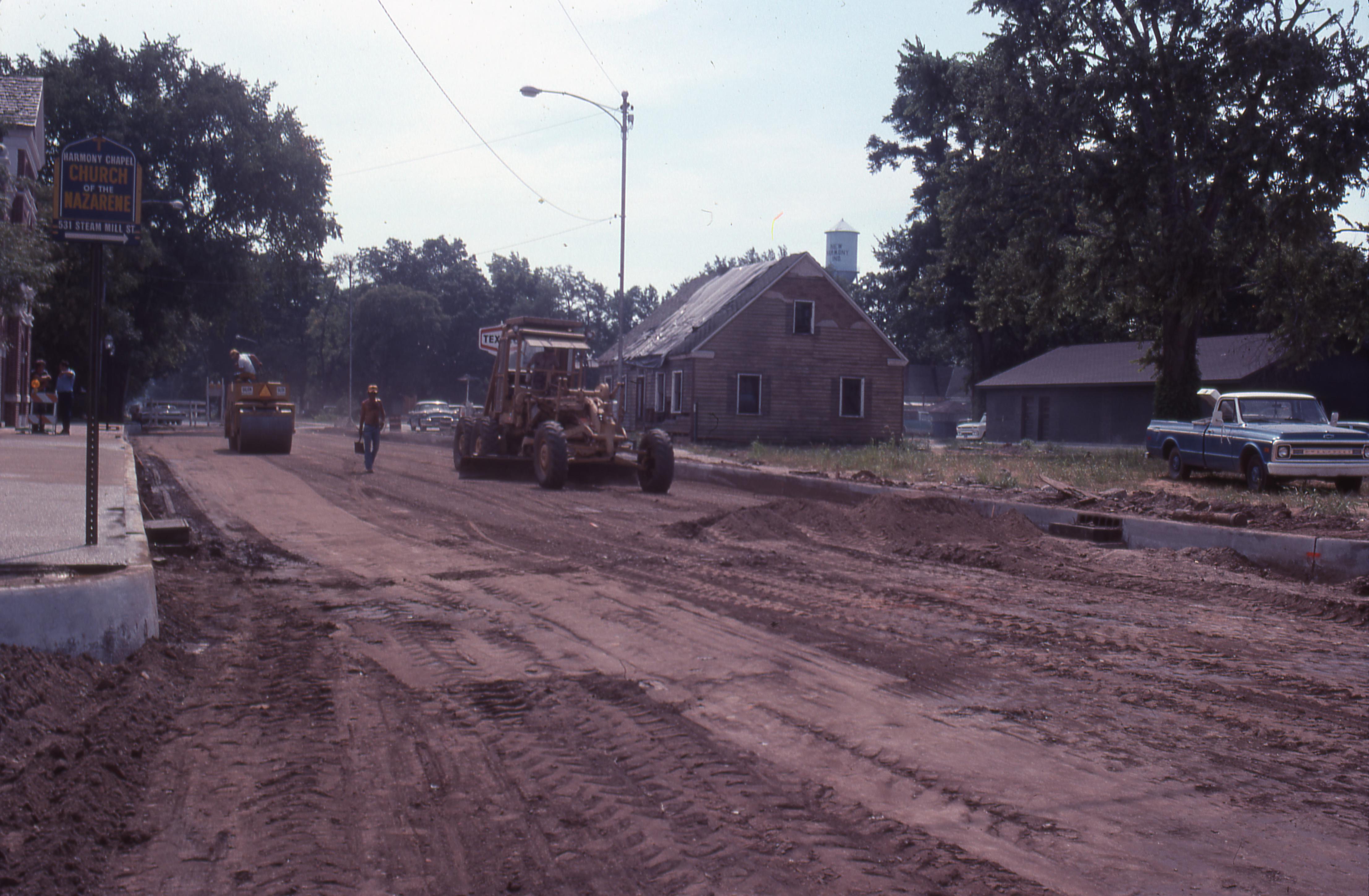 Streets: Church Street, facing east, at the corner with Brewery Street during the replacement. Note the Beal House in the center of the photo and Thrall's Opera House, just out of sight, on the left side. The old New Harmony water tower can be seen just above the Beal House.