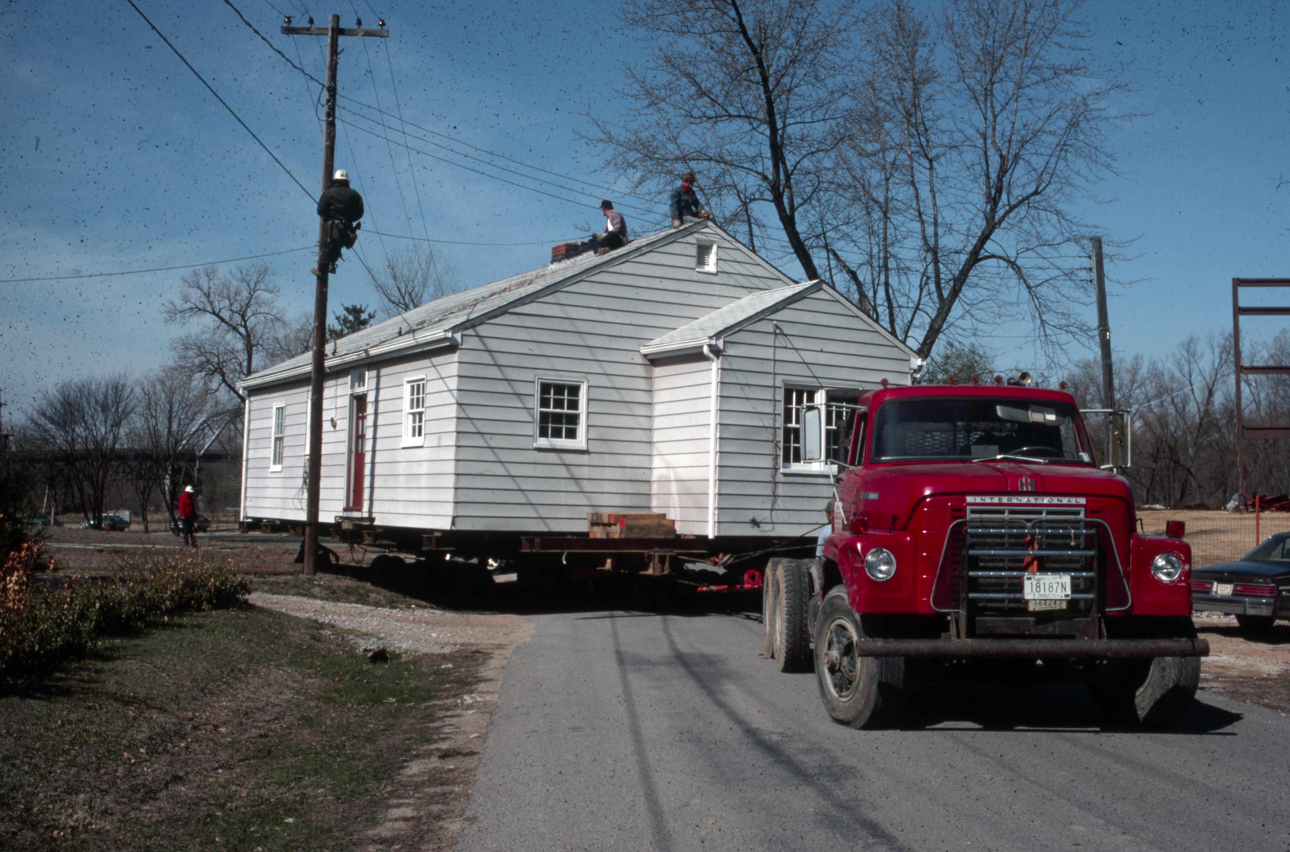 Relocations Collection: Fisher House. The Fisher House was moved from an area just north of the old Harmonist Cemetery to 715 West Street. Elmer Buchta Trucking Company was tasked with accomplishing this move as well as many other building relocations during this time. Construction on the New Harmony Atheneum visitor's center can just be seen on the right side of the photo.