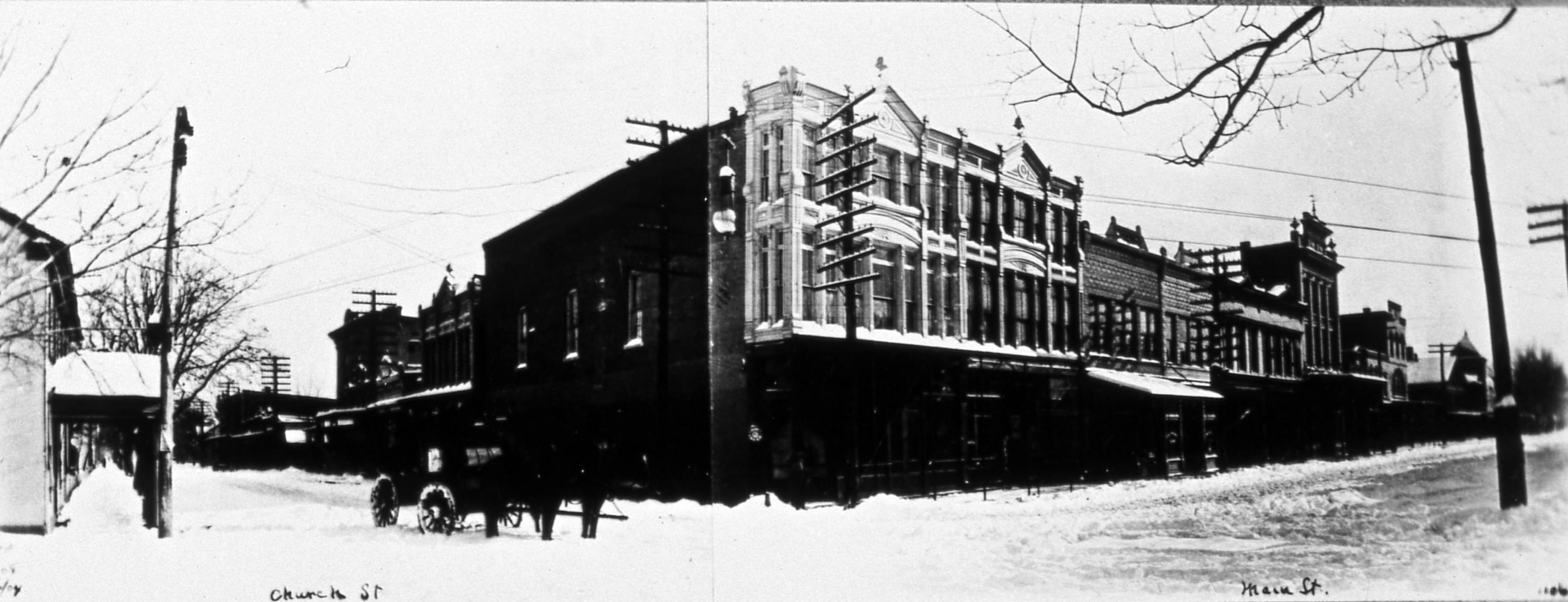 Streets: This historic photo is very unique. The photo was made by the joining of two other photos note the seem in the center. The join was from UA58 - 7510 and UA58 - 7505. This is the southeast corner of Main and Church Streets, under a heavy blanket of snow, probably taken January 26, 1904.