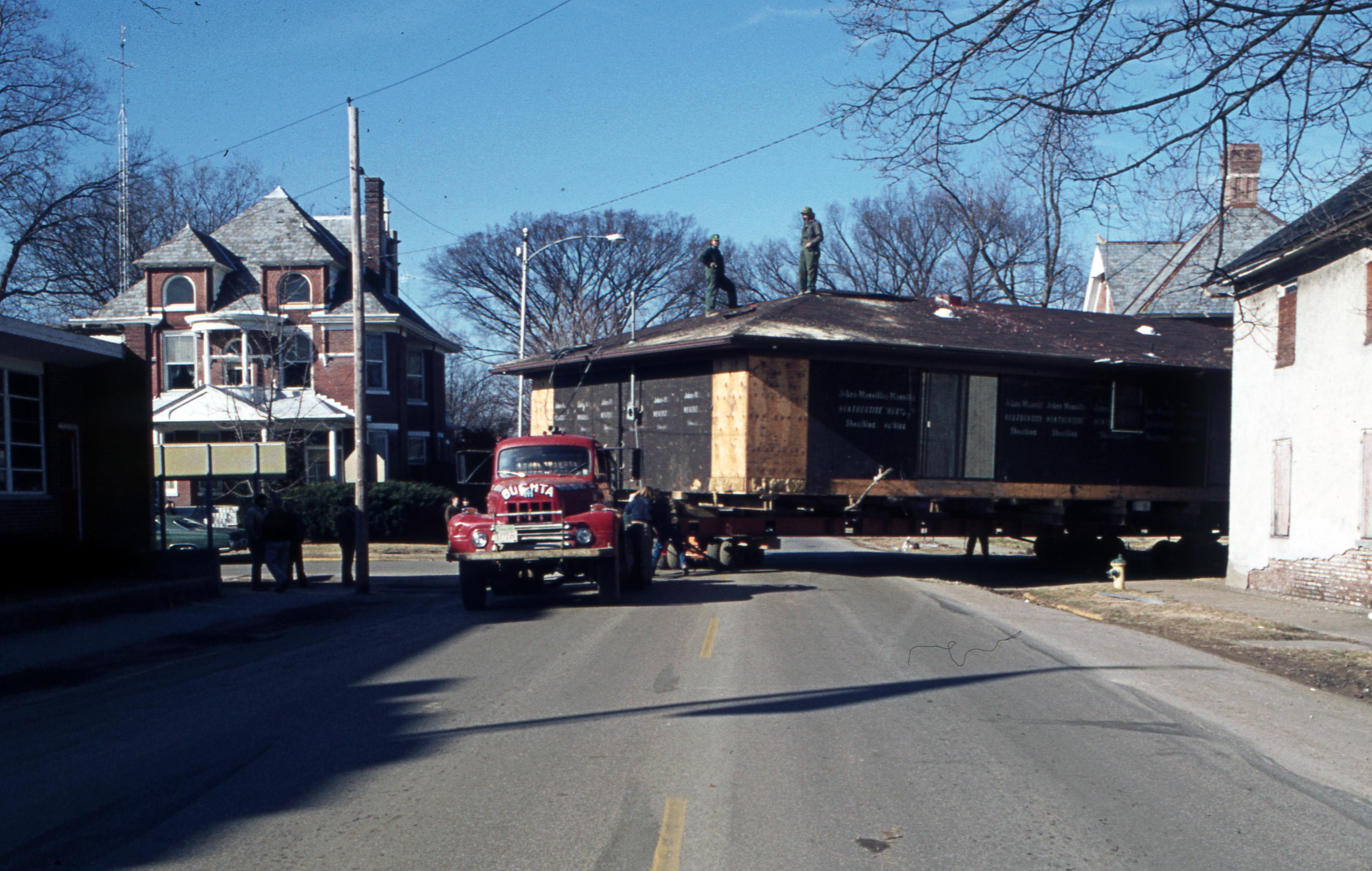Bauer House: This house was originally located on the north side of North Street in town block 2 C/E. It was moved to the new location at 518 First Street before construction on the Atheneum had begun. Elmer Buchta Moving Engineers was contracted for this and many other building moves during the 1970s. In this photo the house is at the corner of West and Church Streets. The large brick house on the left side of the photo is located at 503 West Street. On the far left side of the photo is part of the second New Harmony School building.