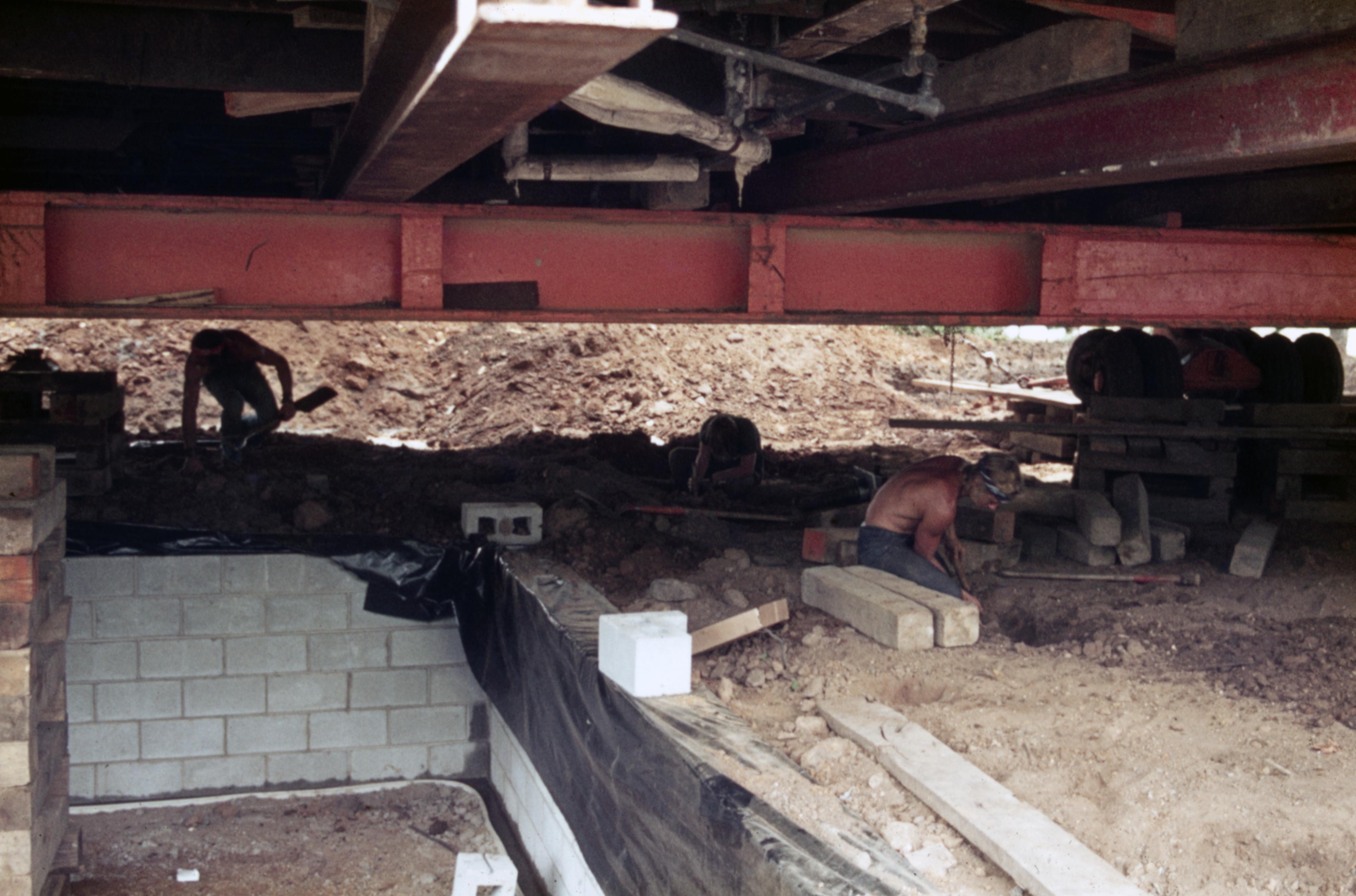 Barrett House Move: This house was originally located at 1826 Main Street but was then moved to 604 South Street during the Lanark Construction. Elmer Buchta were the movers. Workmen underneath the house working on the new foundations.