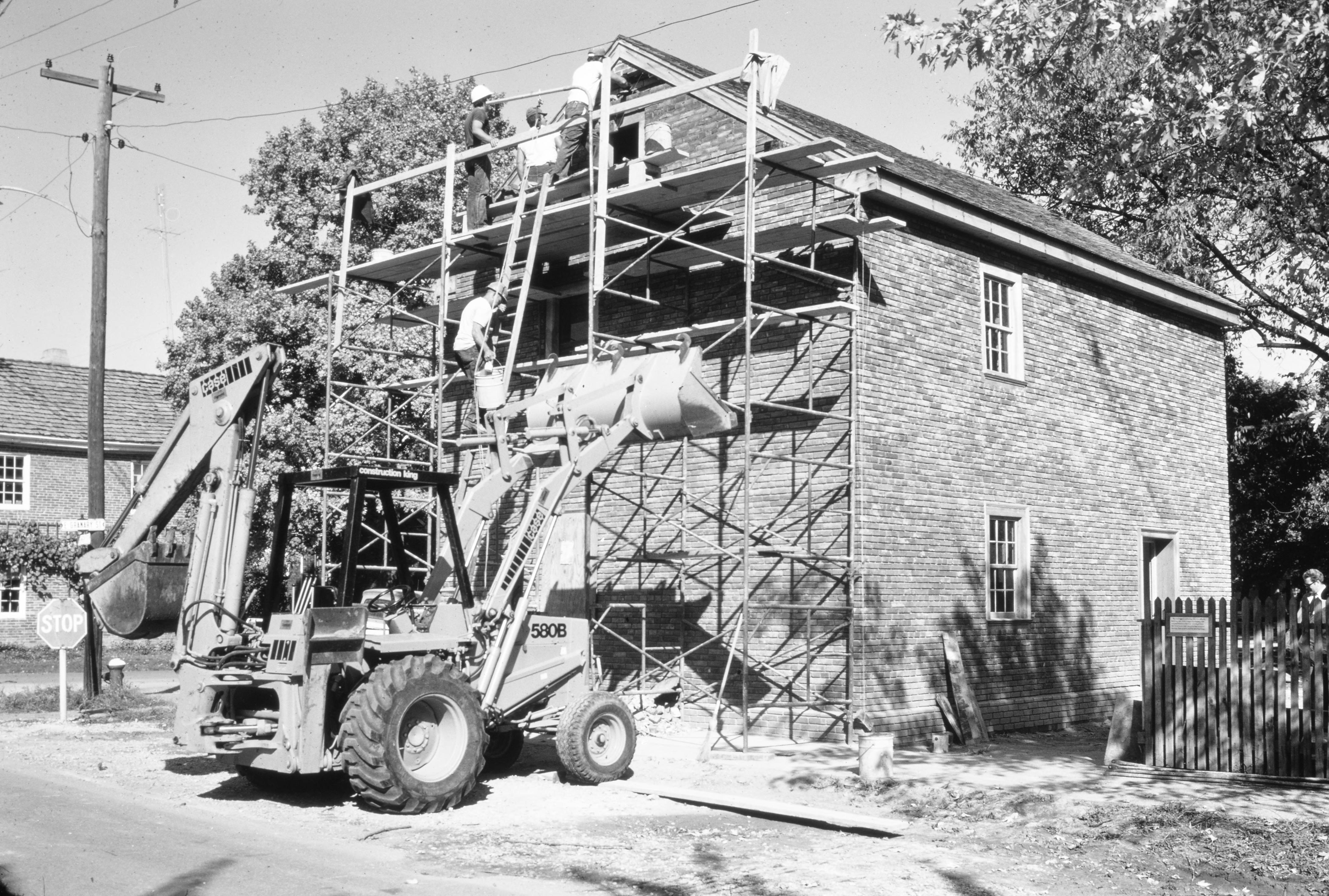 Transparencies and Negatives Collection: Historic photographs. This is a photo of the Wolf House, after it was relocated to the new plat on the southeast corner of Granary and Brewery Streets during refurbishment.